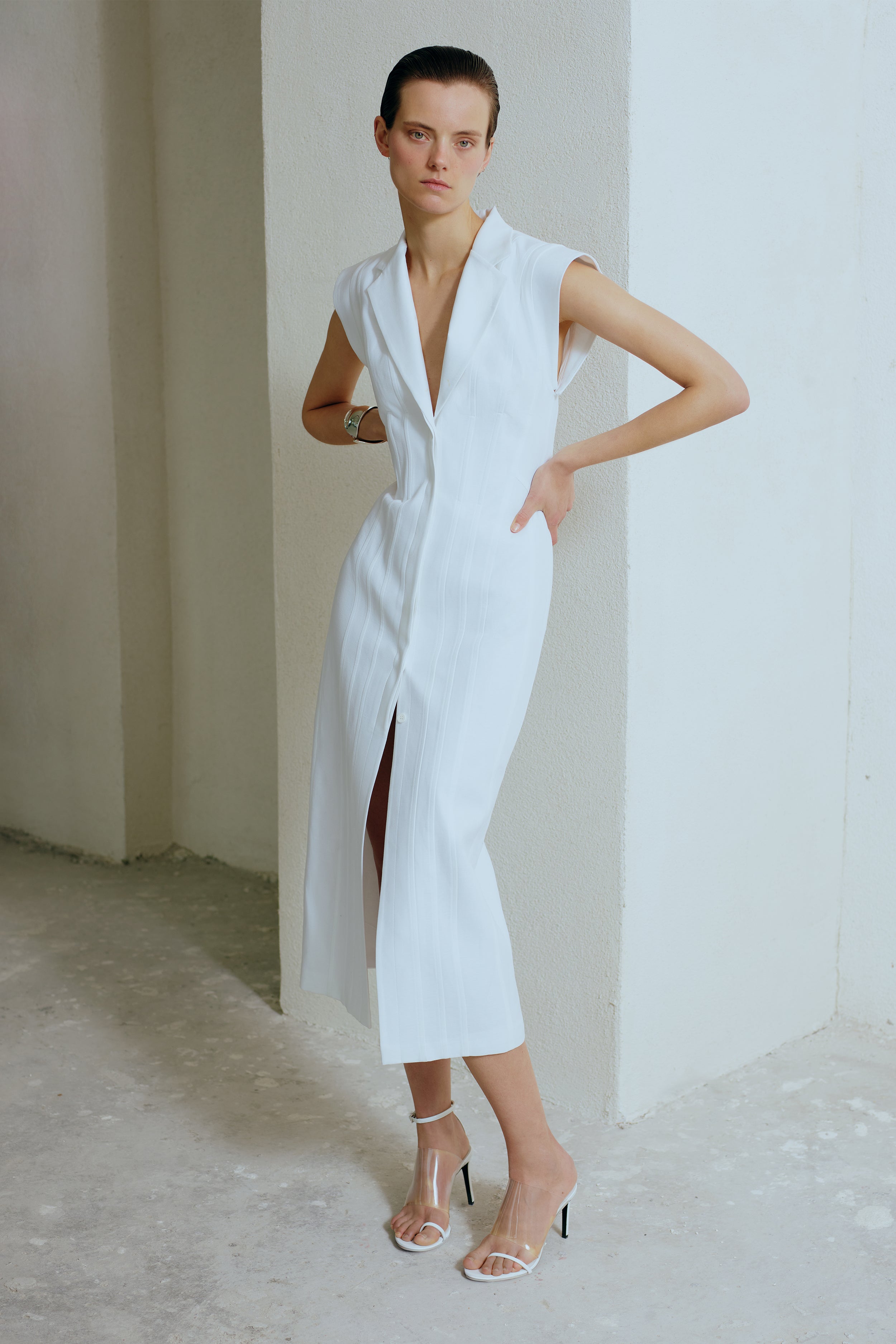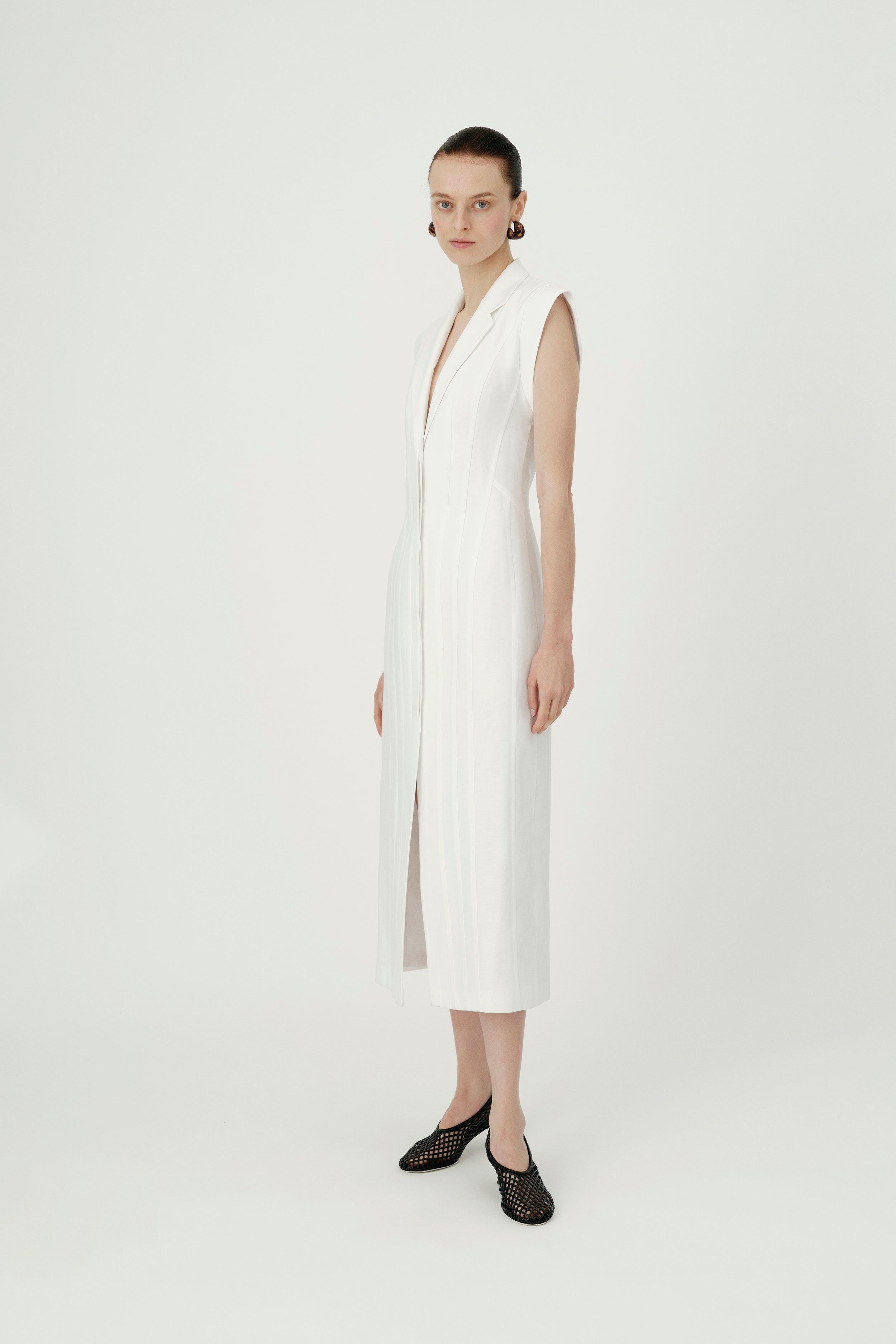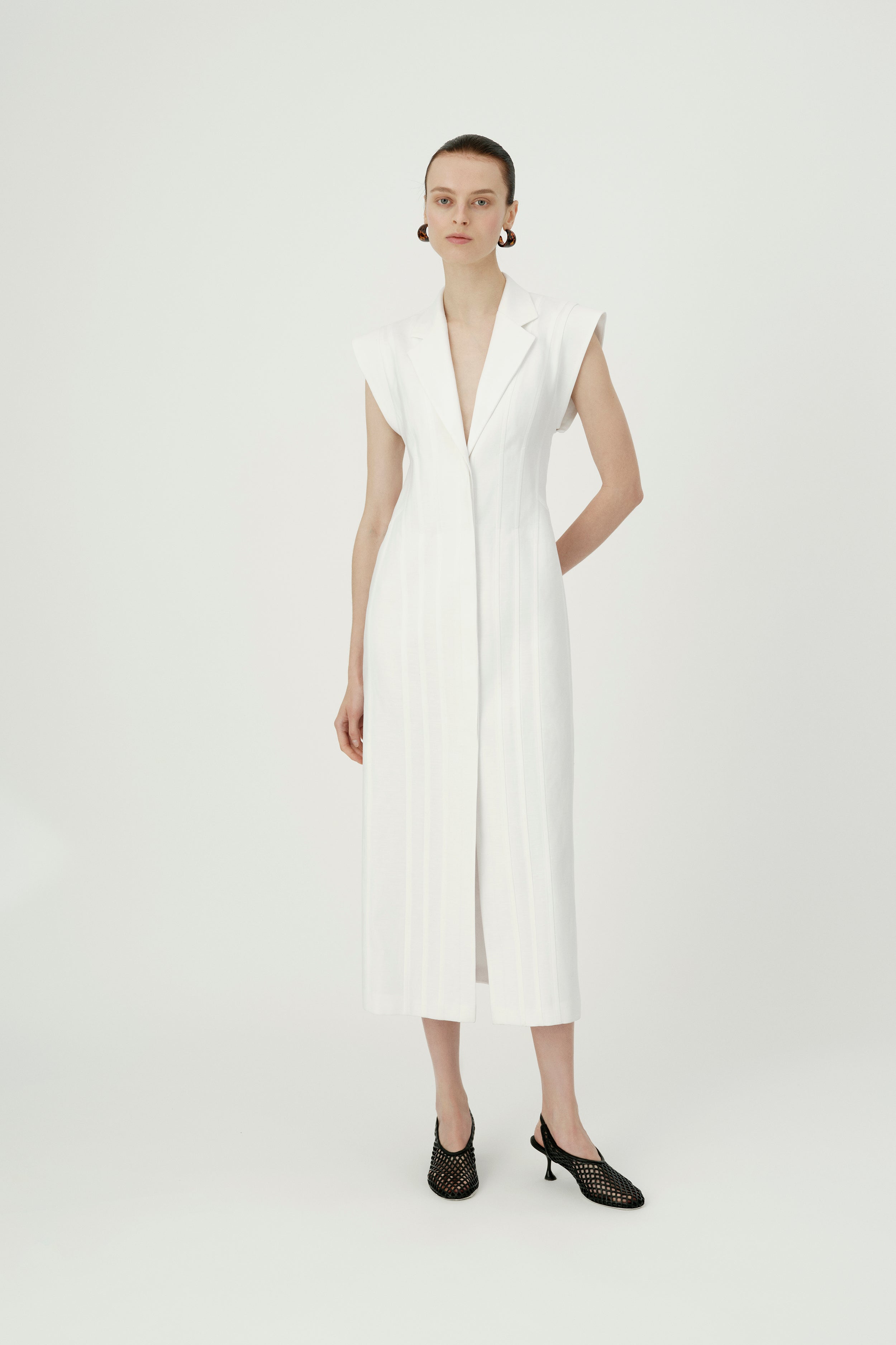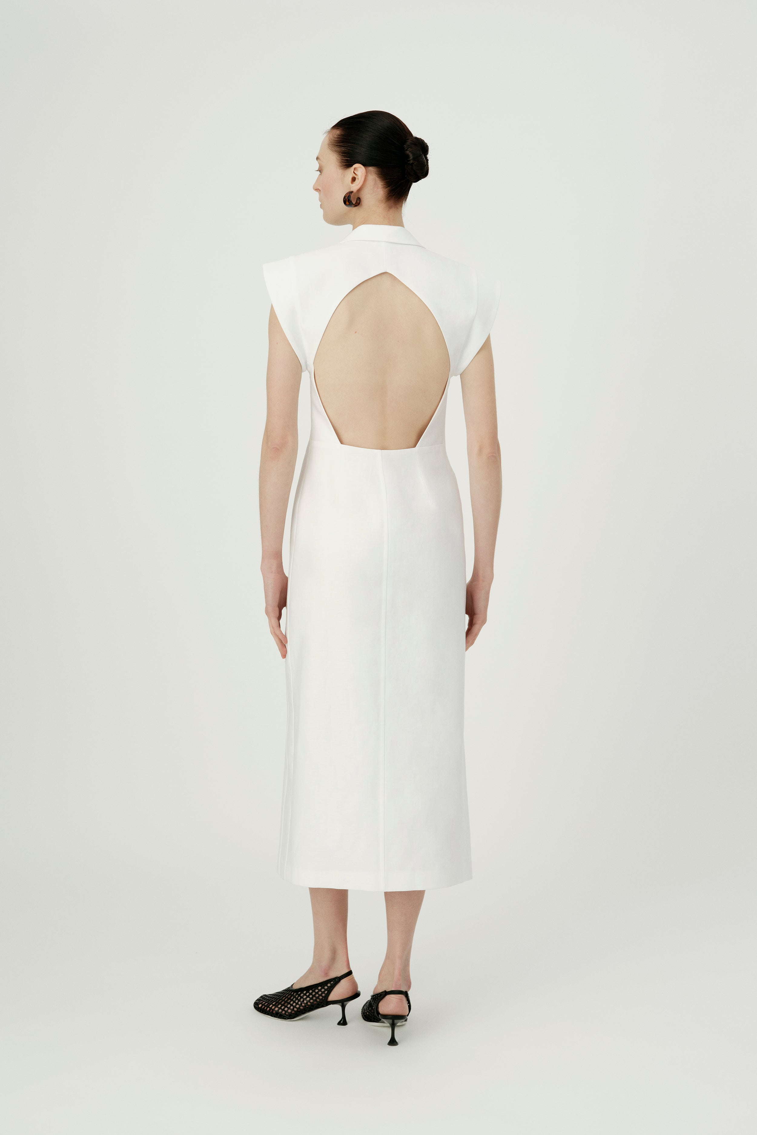 Midi shirt dress tailored from crisp cotton. Bardot Dress exudes an air of effortless elegance with its relaxed yet refined silhouette. It is fitted at the bust with boning and graced with a striking open back. Complete with cap sleeves, notch lapels and a concealed button up placket.