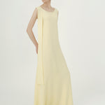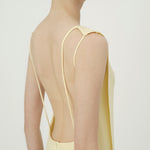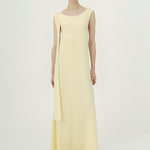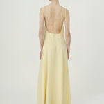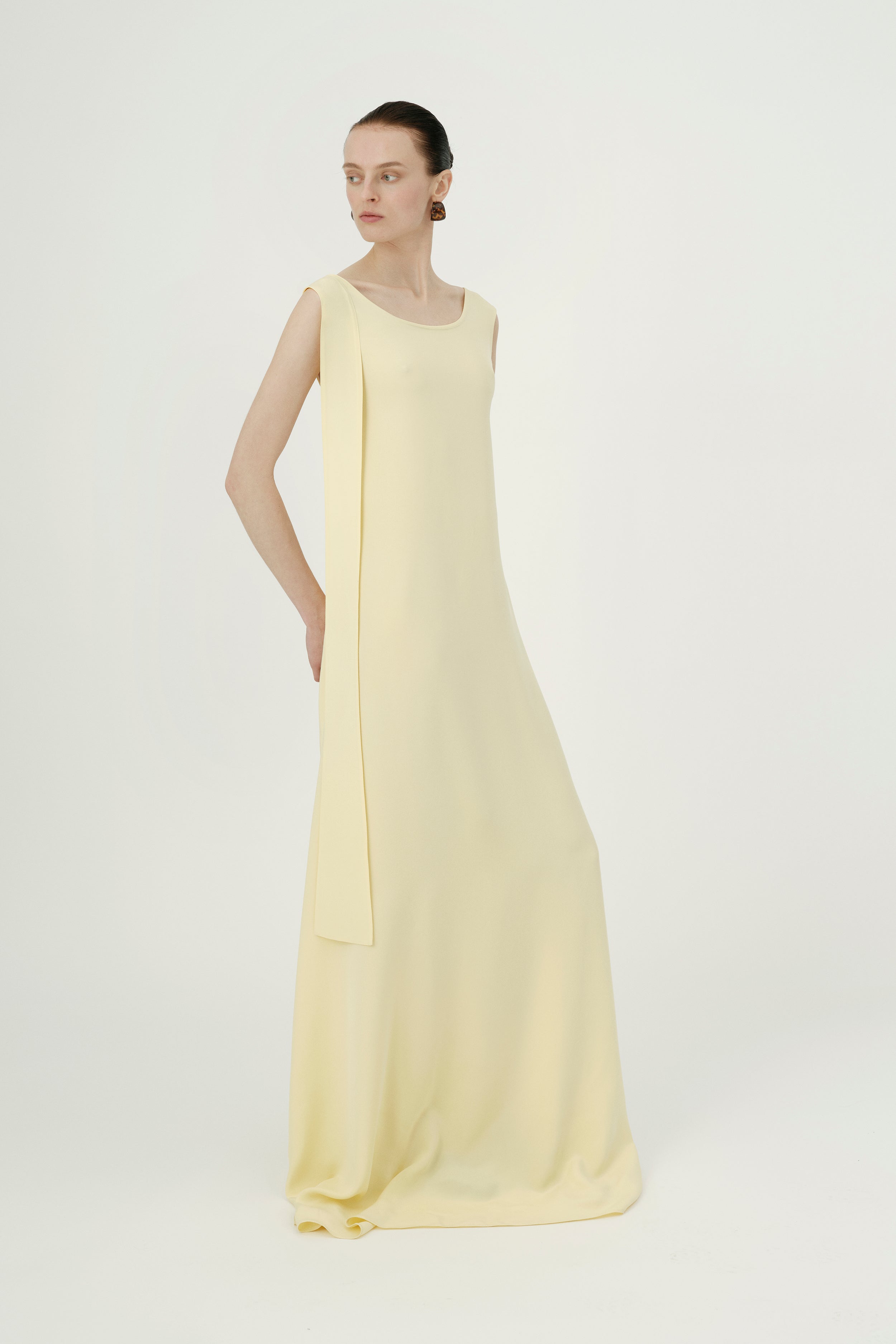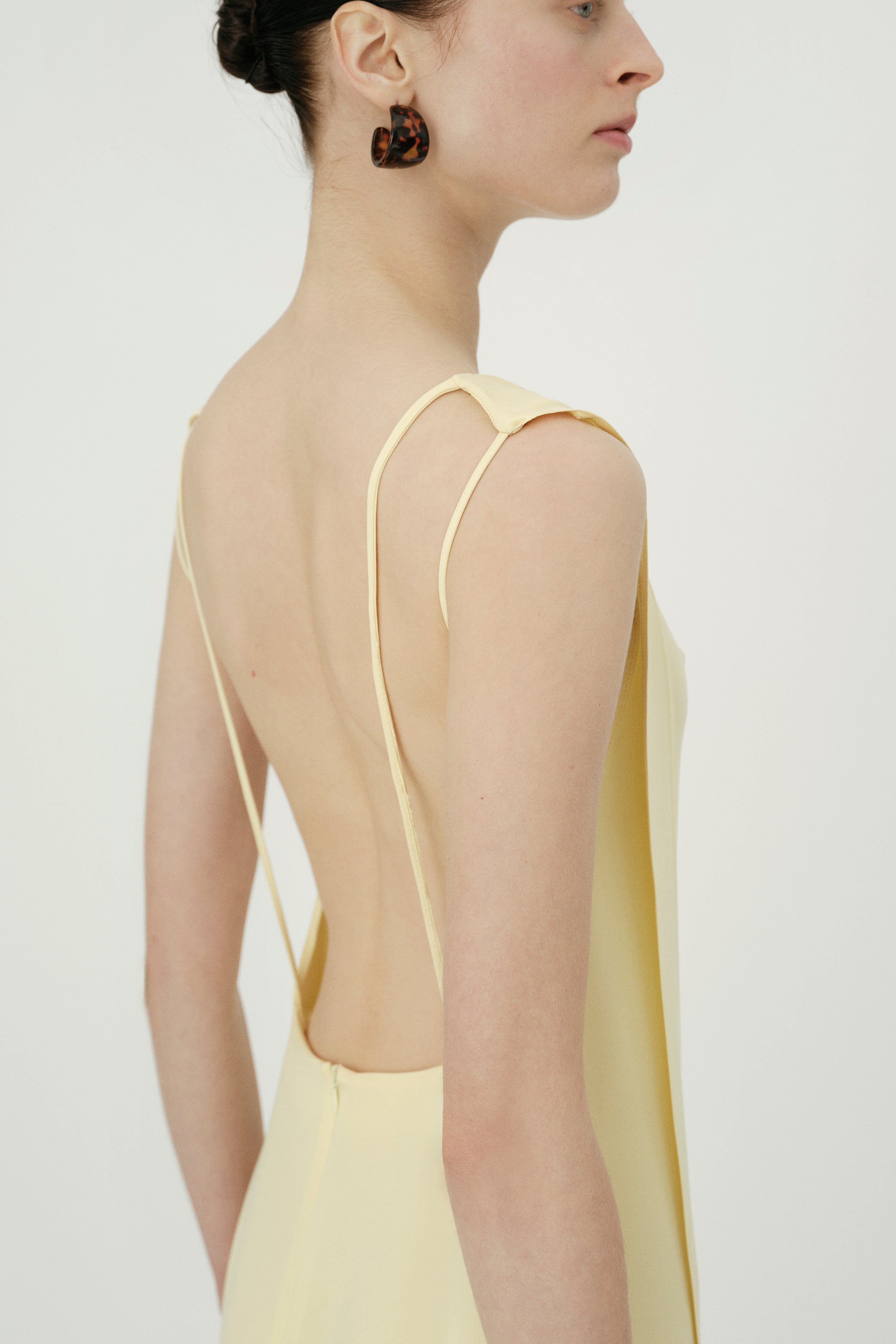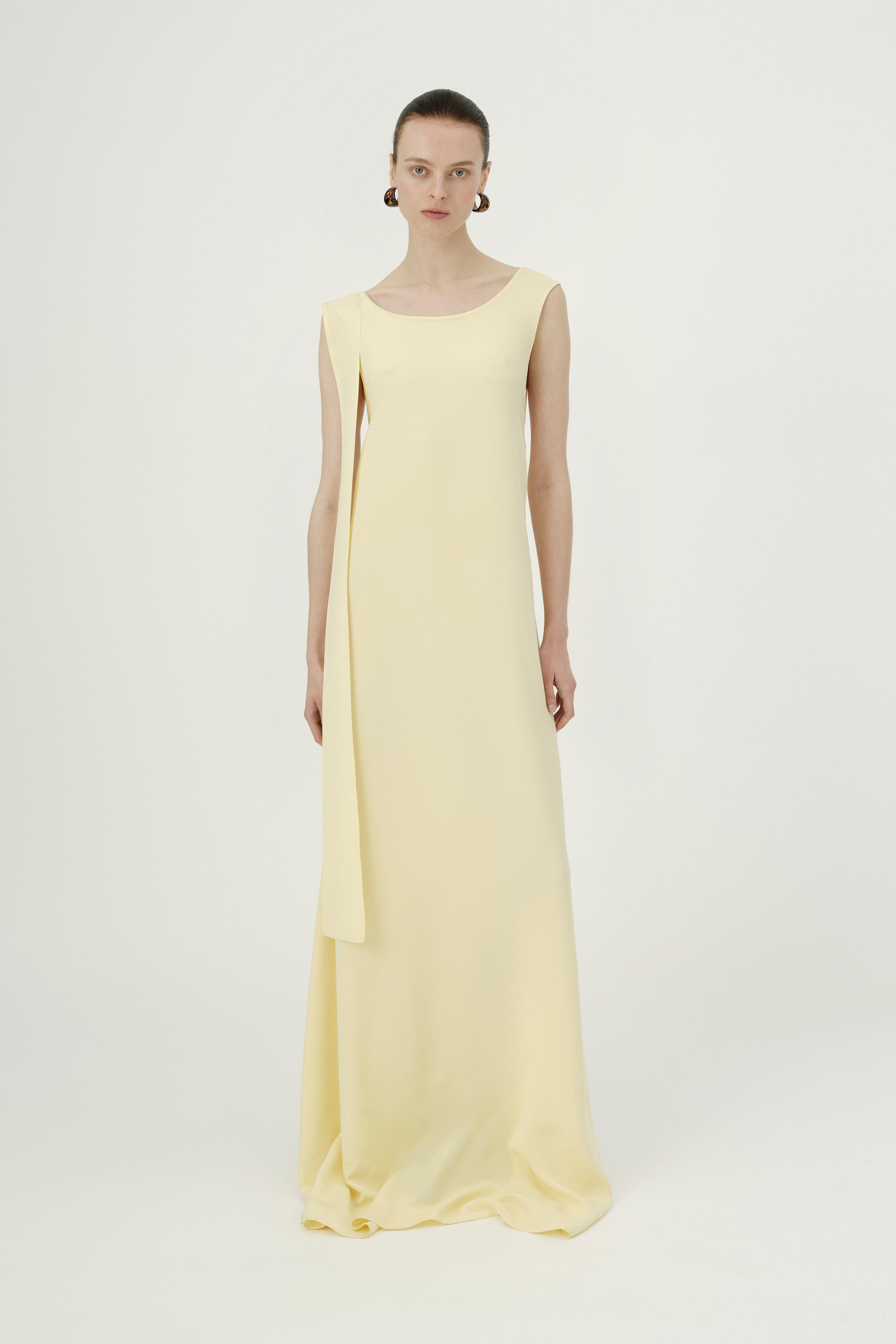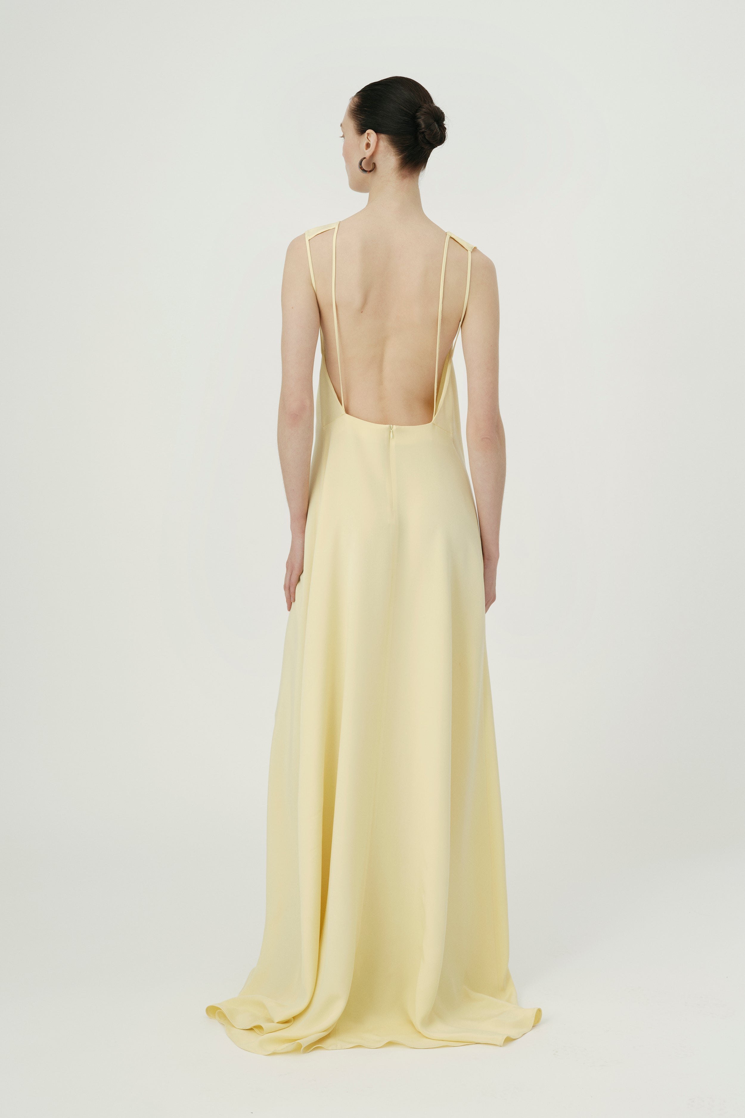 In lightweight silk cady, Victoria is an elegant floor-length dress that exudes modern sophistication with its fluid drape. It features a flattering boat neckline with slightly off the shoulder style that falls into a sultry backless silhouette with double straps. The dress comes with a midi length self-fabric sash adding a touch of dramatic movement. Complete with a concelead back zipper.
