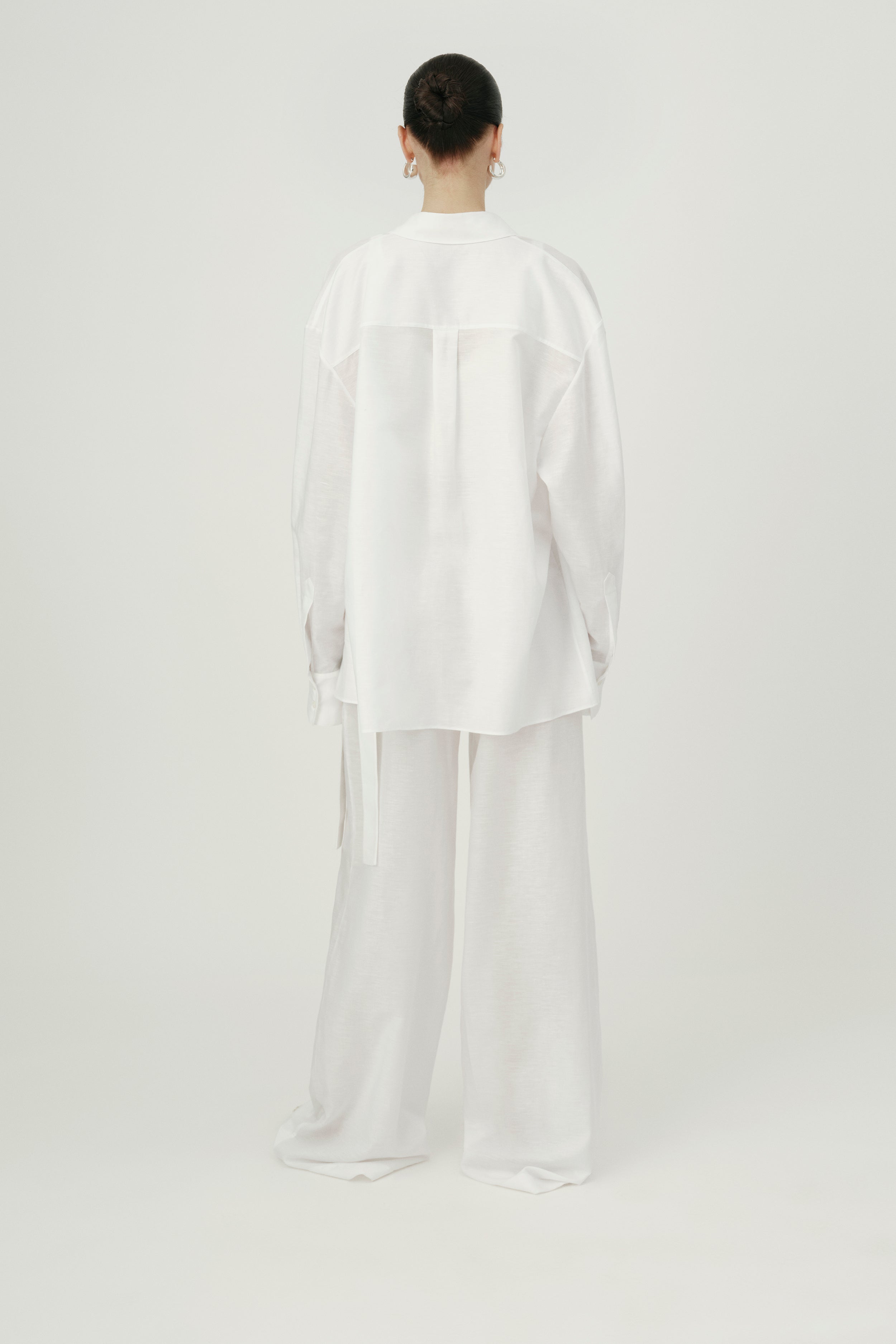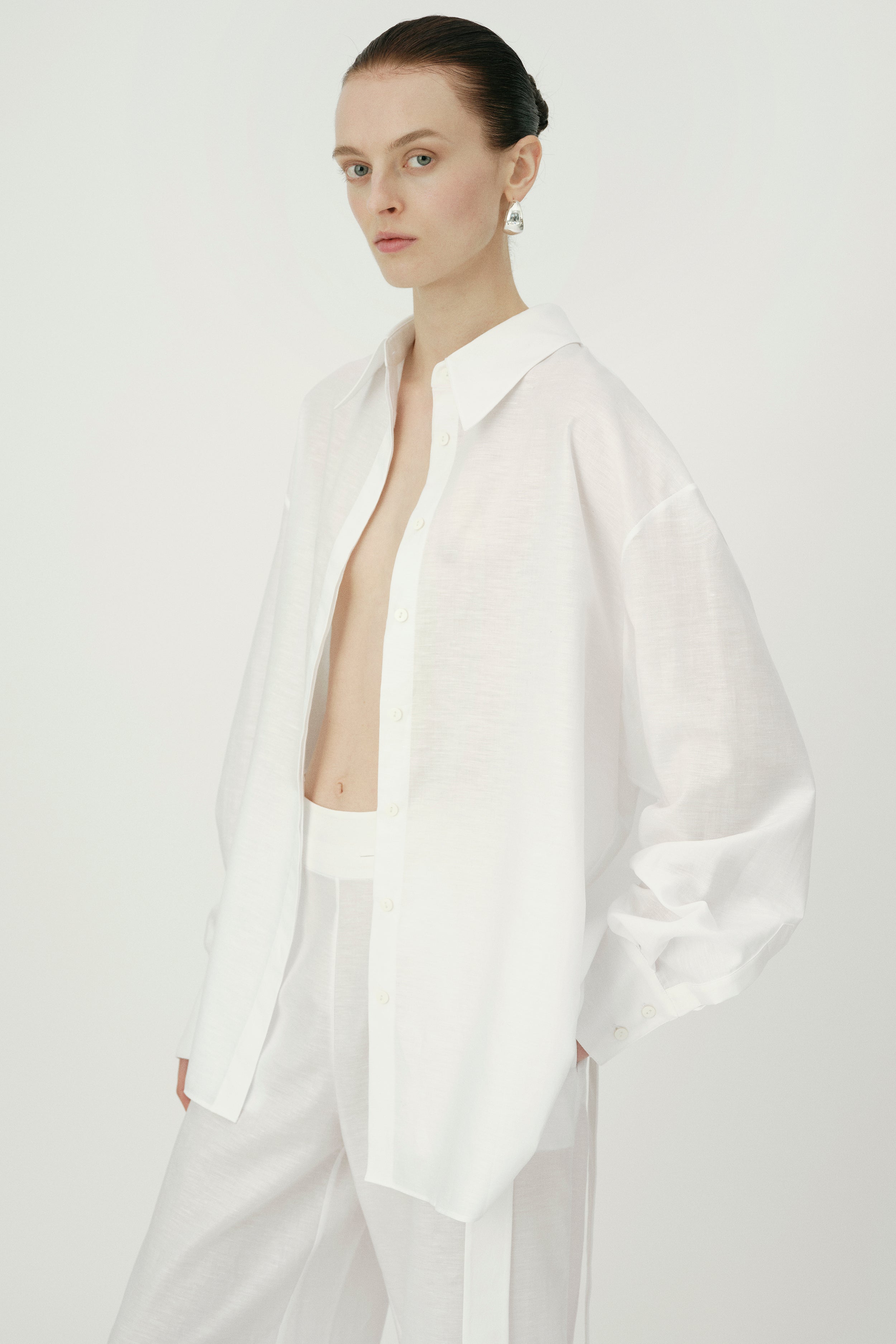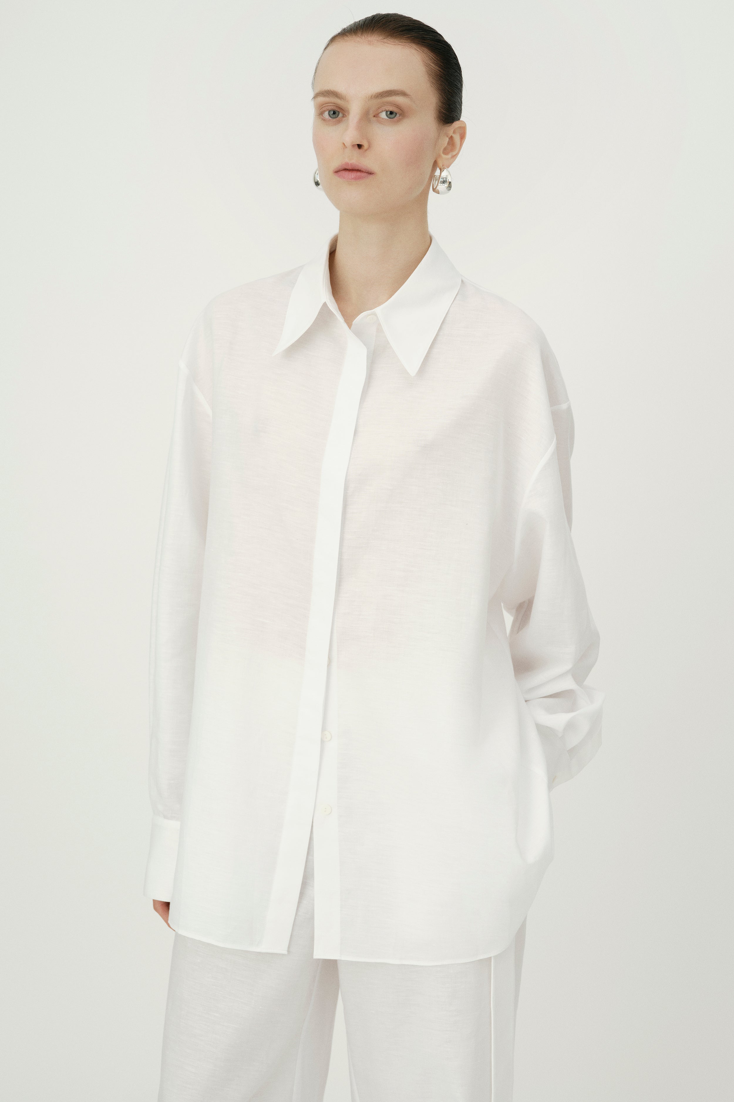 'Oversized shirt in semi-sheer, lightweight cotton. Naomi Shirt is a relaxed button down shirt that embodies a nonchalant elegance. A versatile piece appropriate for any setting, from the city to the beach, the shirt comes complete with a point collar, exposed button up placket, back yoke and long button cuffs.