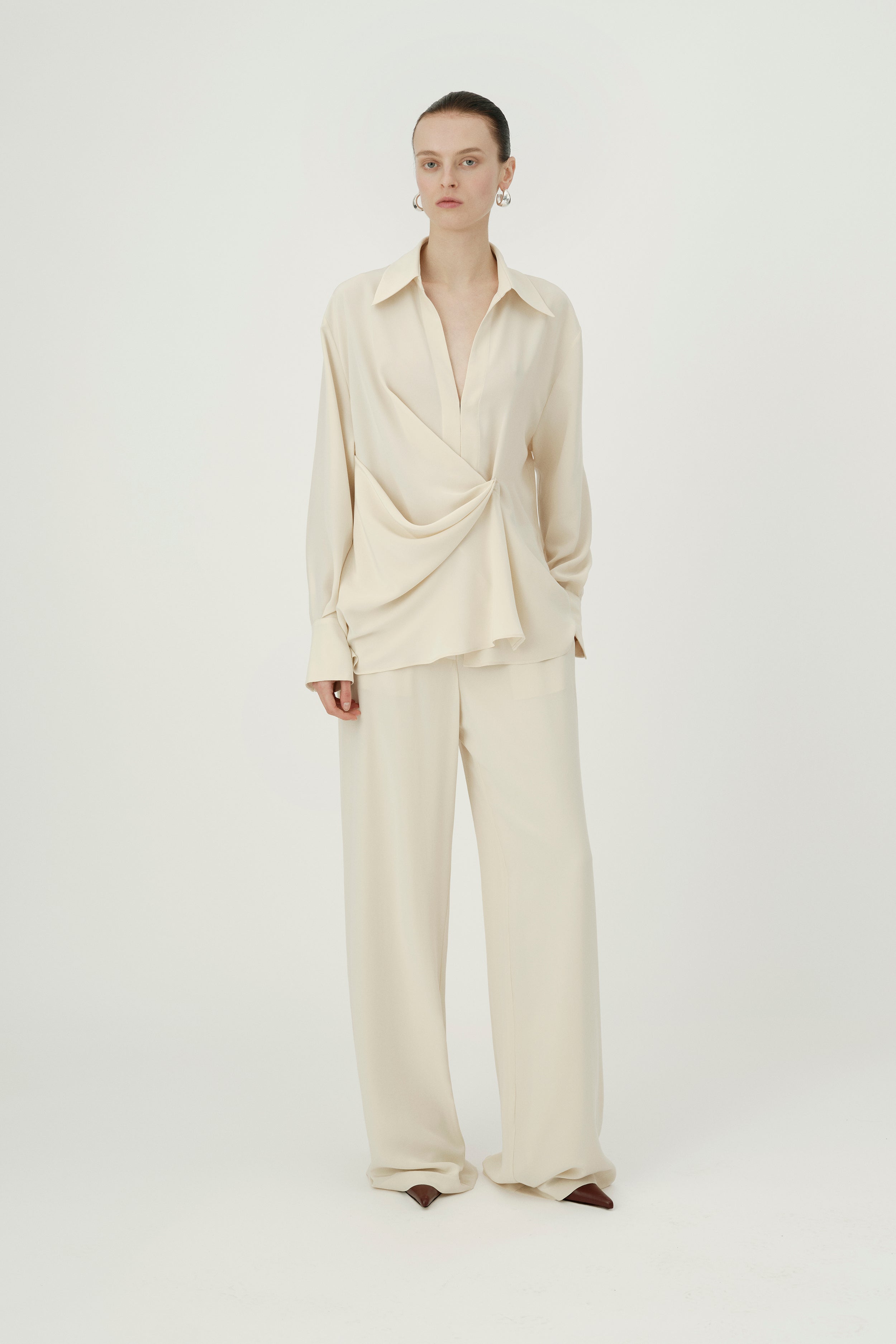 Tilda Shirt is cut from soft Mongolian silk in a wrap construction with an asymmetric gathered draping at the front and features a snap closure to gather the draped fabric in place. Complete with point collar, a V-neckline and long button cuffs.