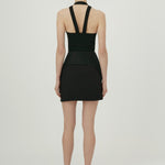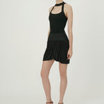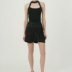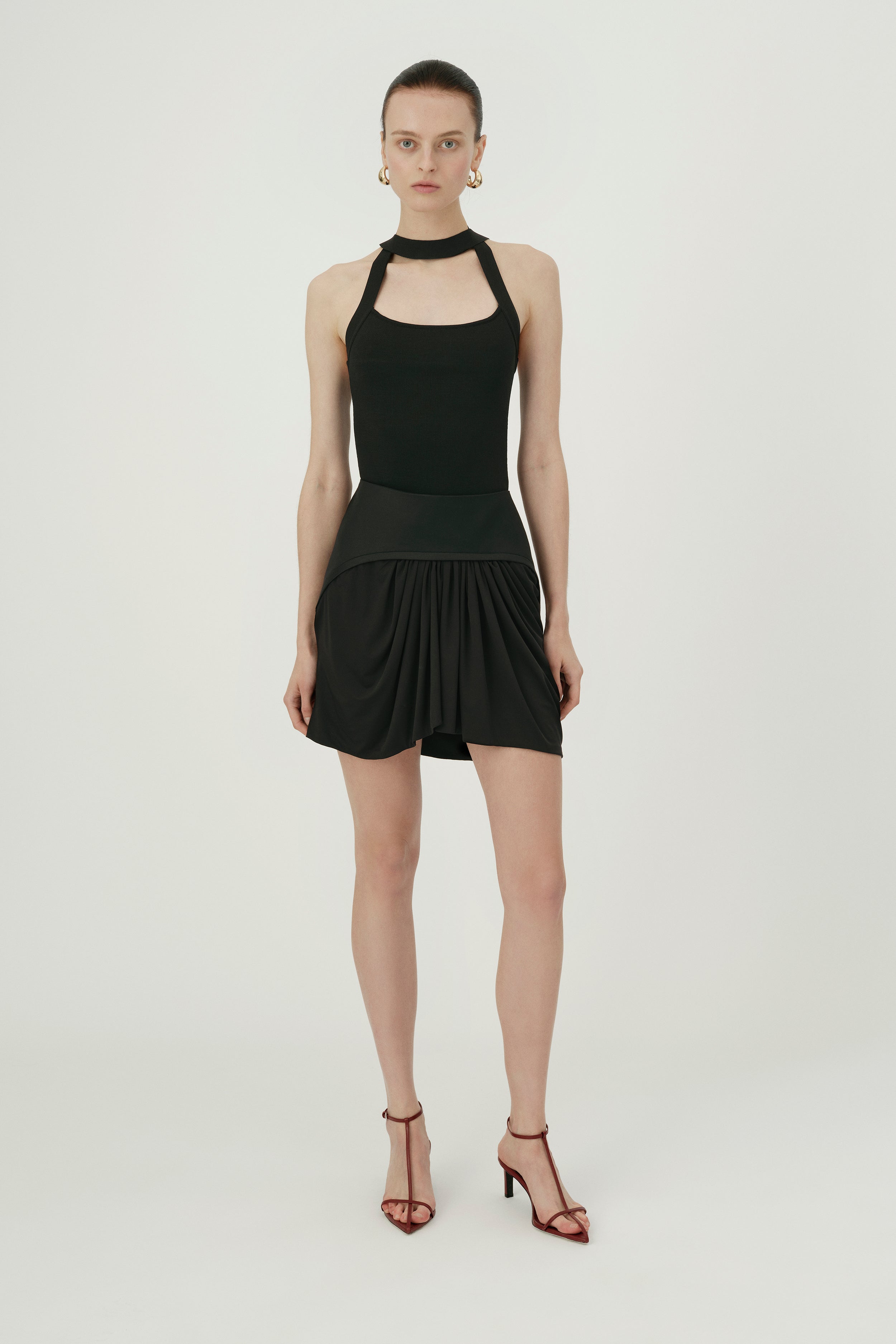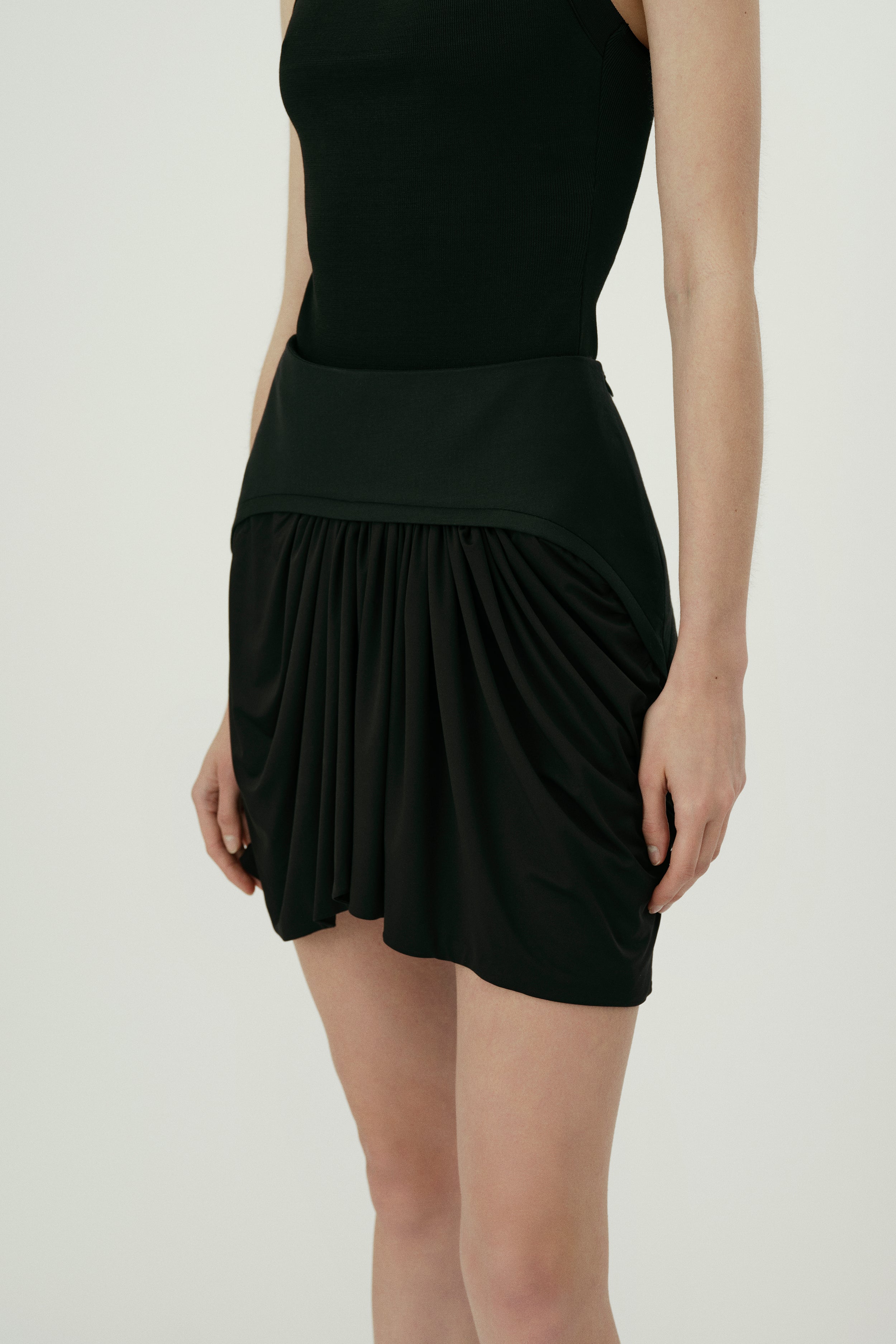 Kaia is a mini skirt cut in silk jersey with a wide, curved yoke in wool at the hip. It is delicately ruched at the front for added dimension and the flared hem creates movement. Complete with a concealed side zipper.