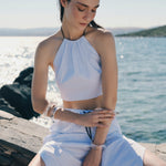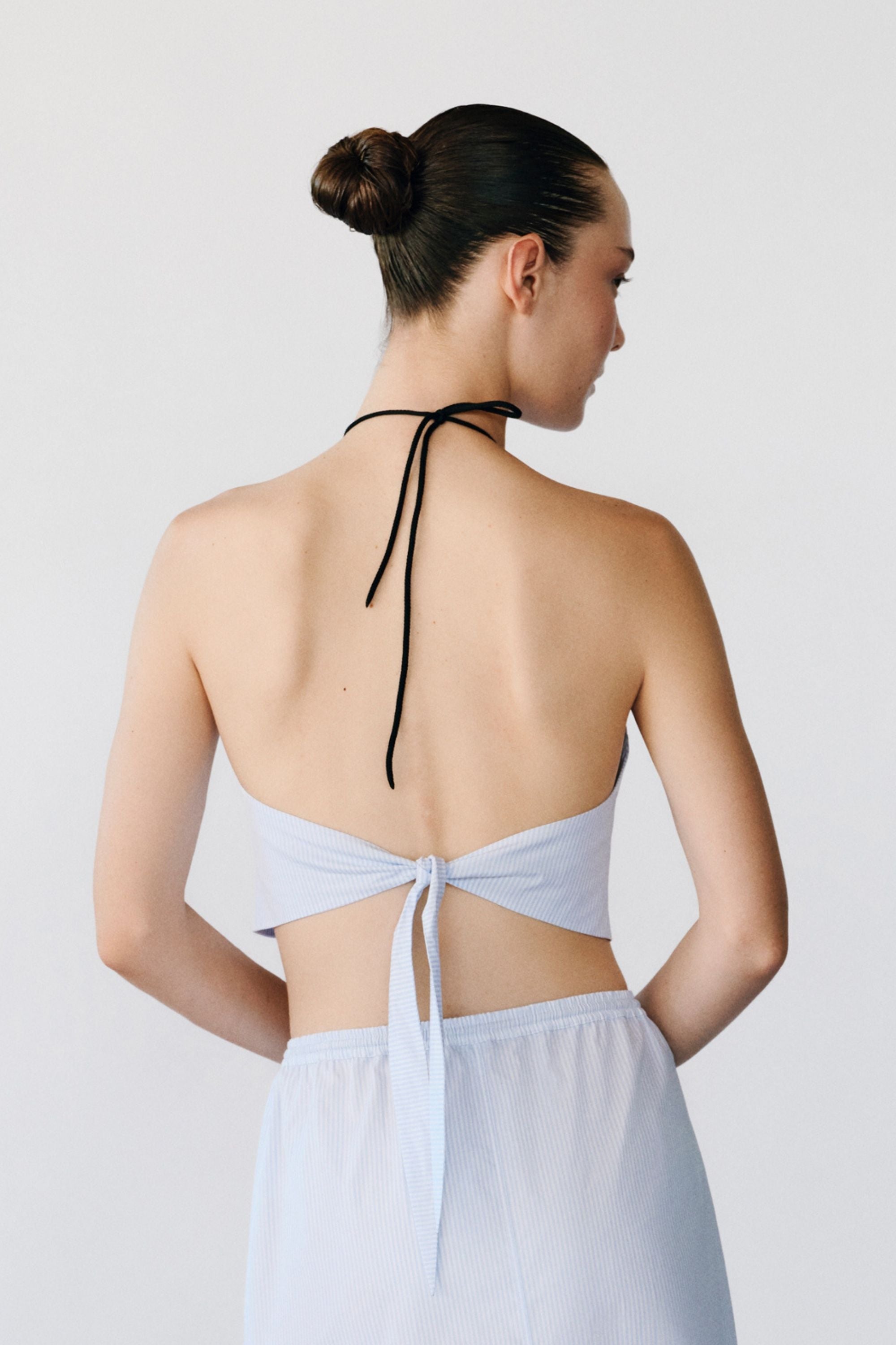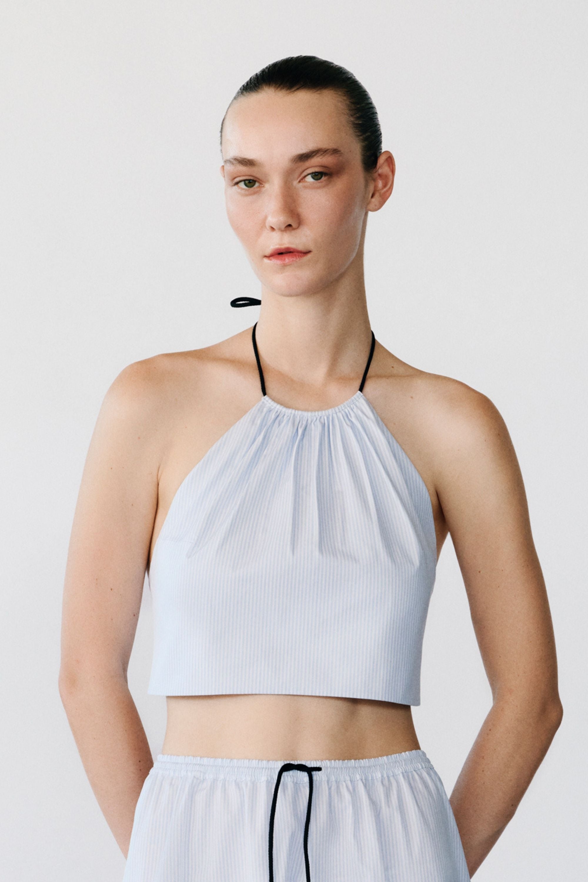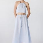 Cropped halter top with self-tie back and a gathered neckline that is adjustable with a contrasting drawstring. Cut from crisp cotton patterned with blue stripes, the Ezzo Top is a versatile piece offering endless styling possibilities.