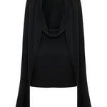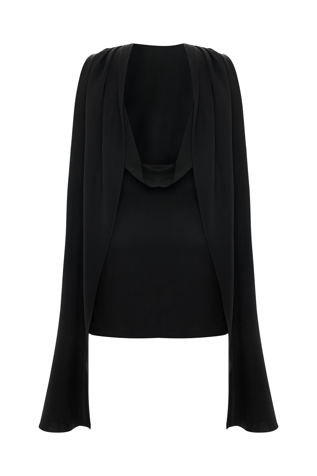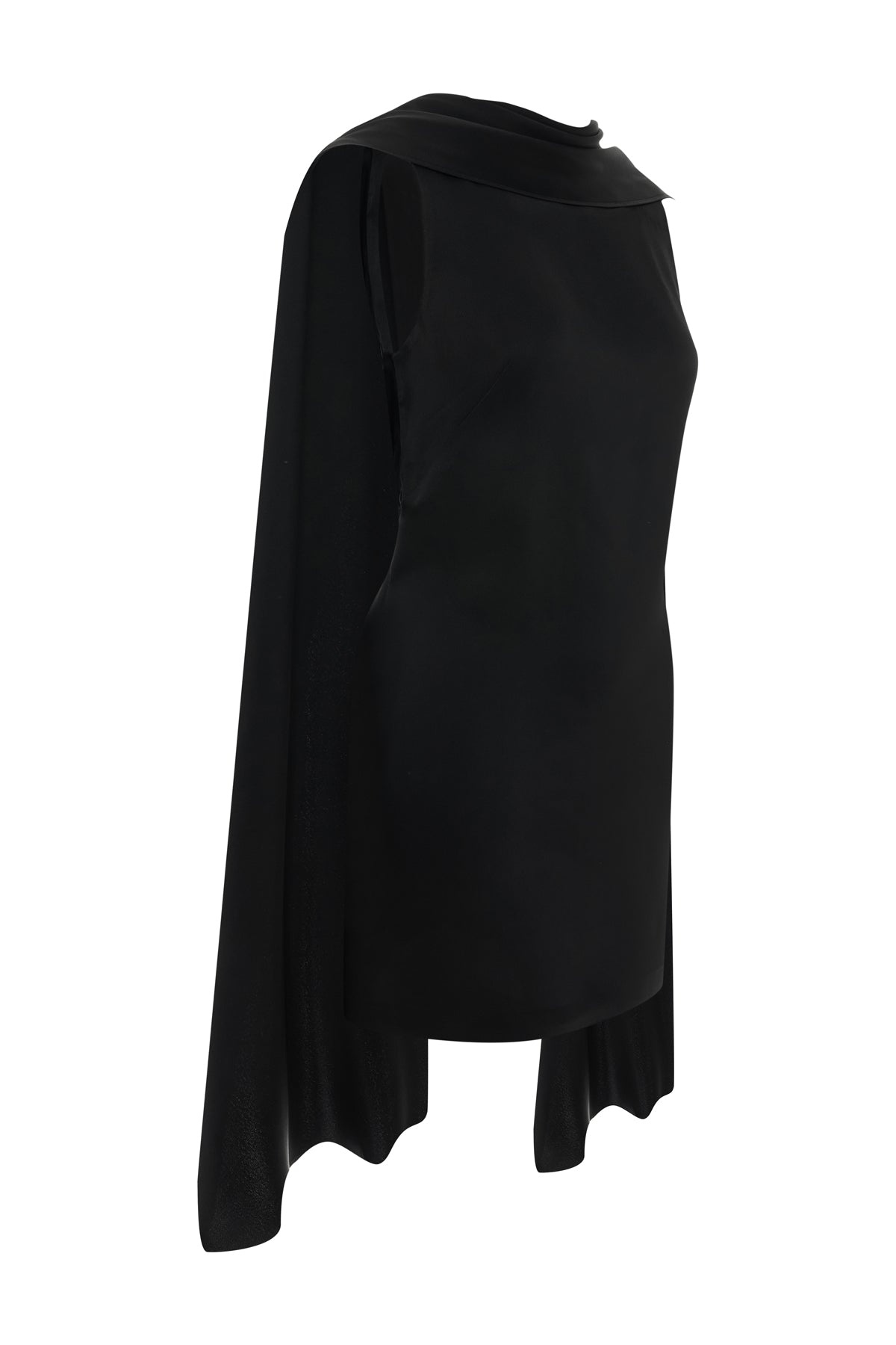 Mini dress with a flowing cape-effect panel and draped open back. It’s cut from viscose that gives a gentle structure to the silhouette.