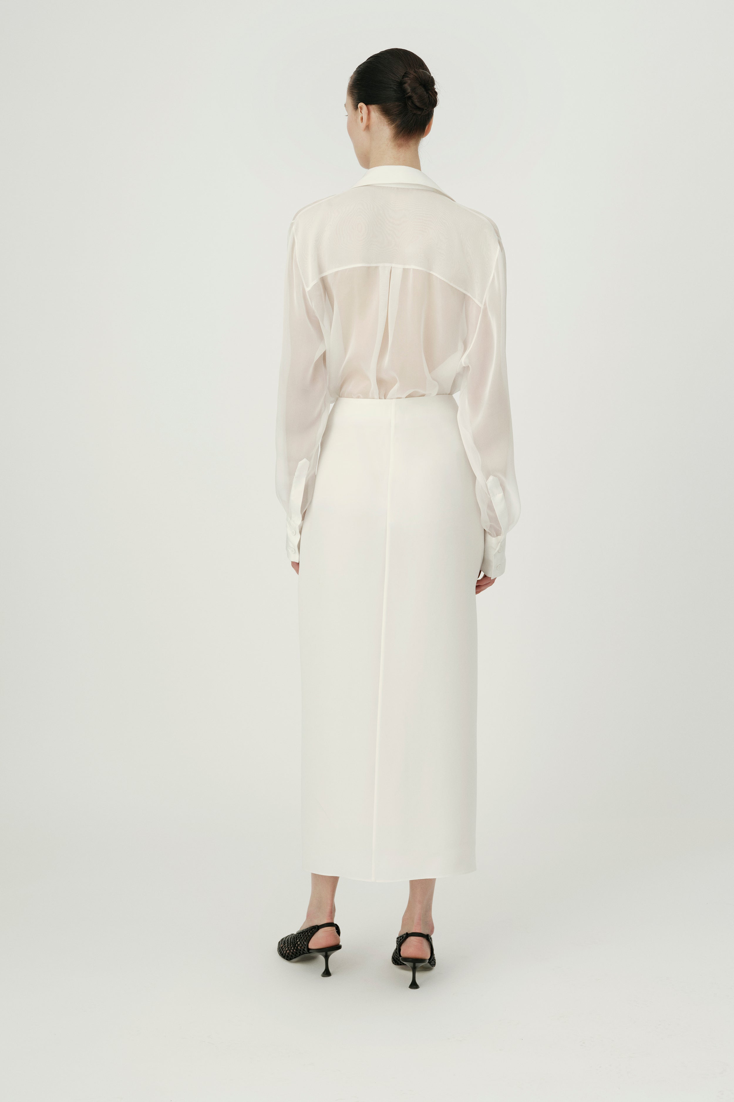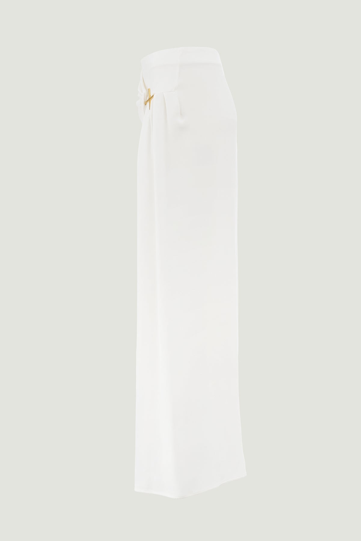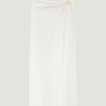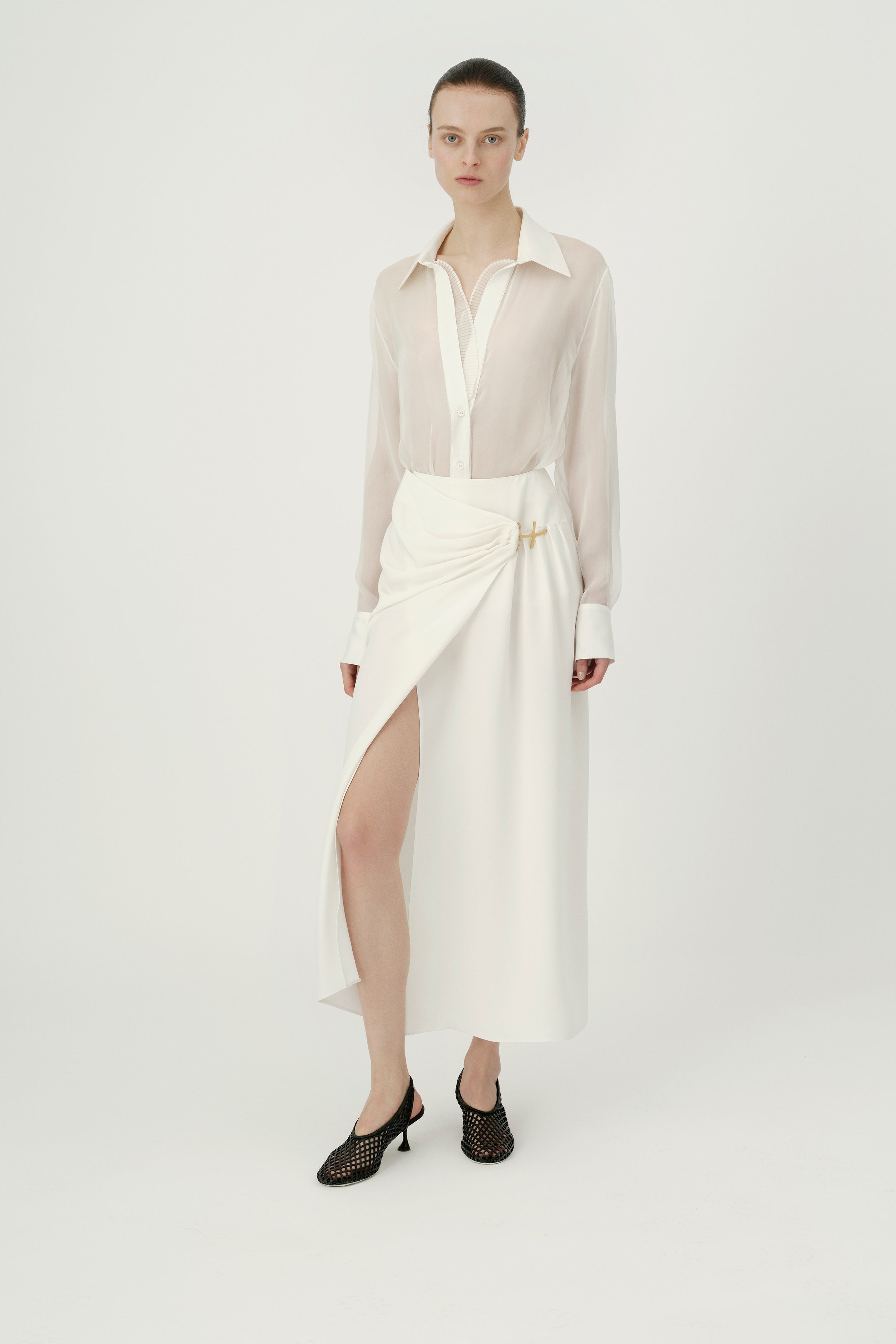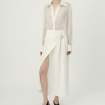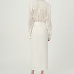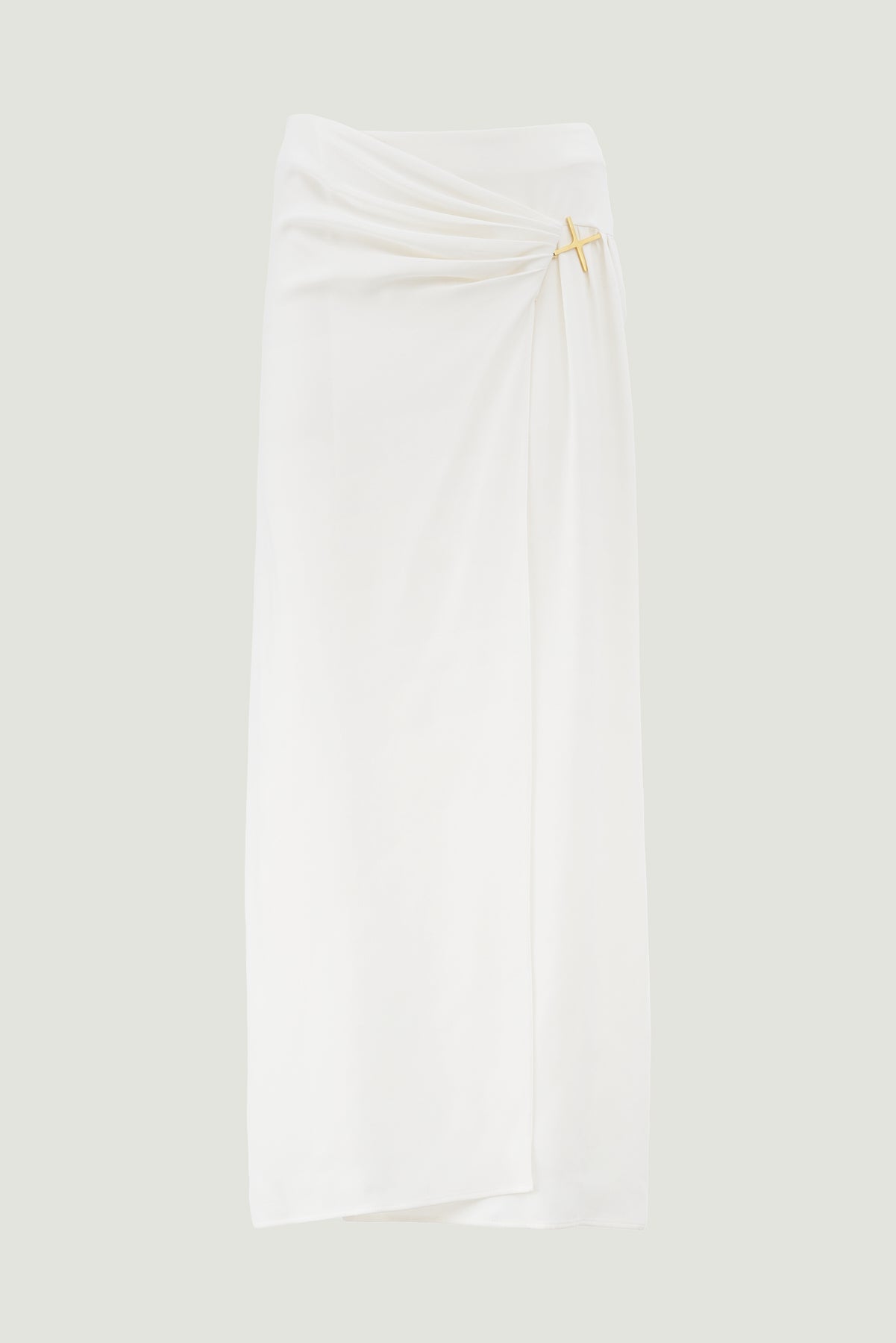 Cut from lightweight silk cady in a fluid wrap design, Cindy Skirt has a draped silhouette with a thigh-high opening at the side. The elegantly understated skirt boasts a gold tone monogram hardware detail gathered at the waist.