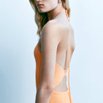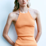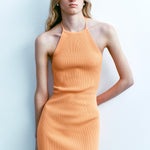 Sertifikalı sürdürülebilir viskon karışımlı triko elbise. Esnek yapısıyla vücudu saran halter yaka mini elbisenin sırtı derin V kesimli ve geometrik kesik detaylıdır. Boyun arkasında ince askılarla bağlanır.