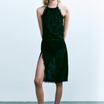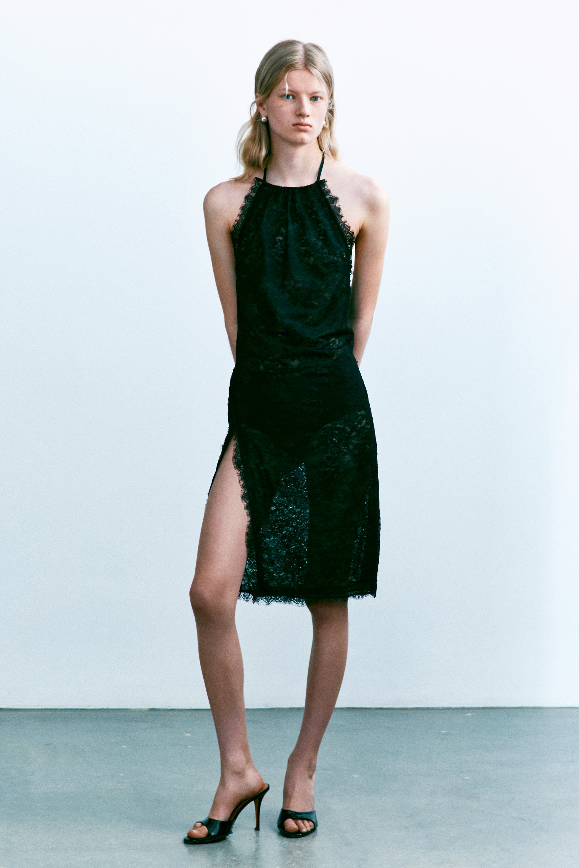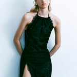 Tamamı yumuşak ve transparan dantelden tasarlanan midi elbise, boyun arkasında bağlanan ince askıları ile halter yaka tasarımına sahiptir. Vücudu saran kesimi, hareket özgürlüğü ve dramatik etki için derin yan yırtmaç ile tamamlanmıştır.