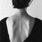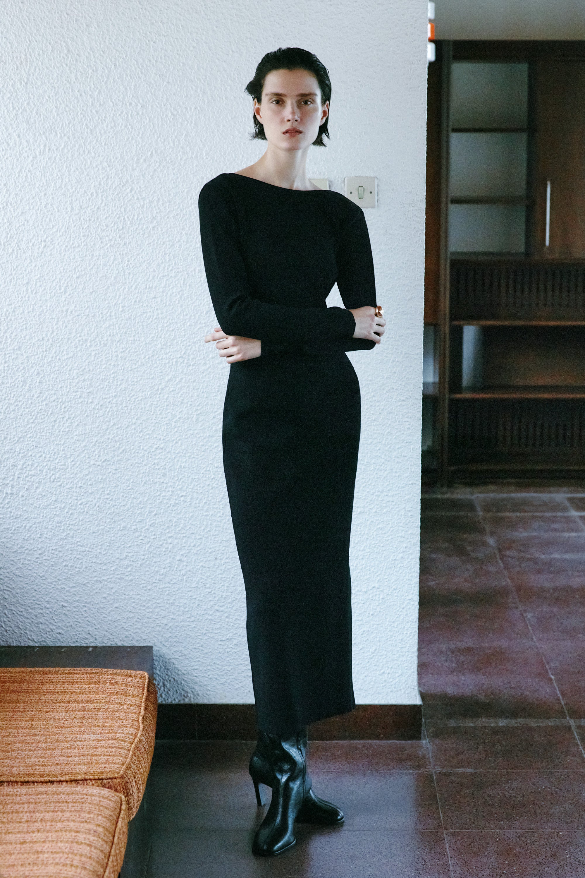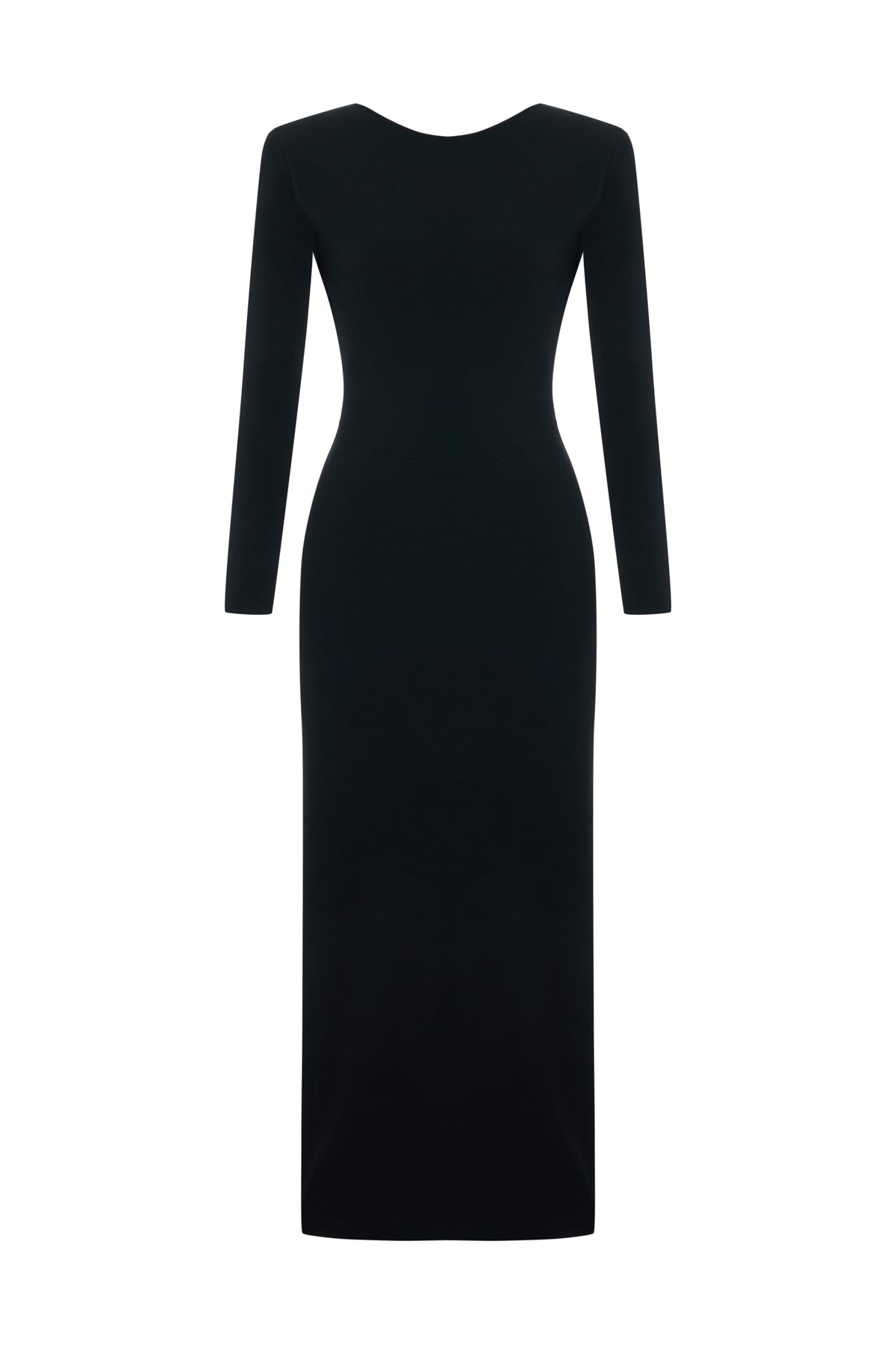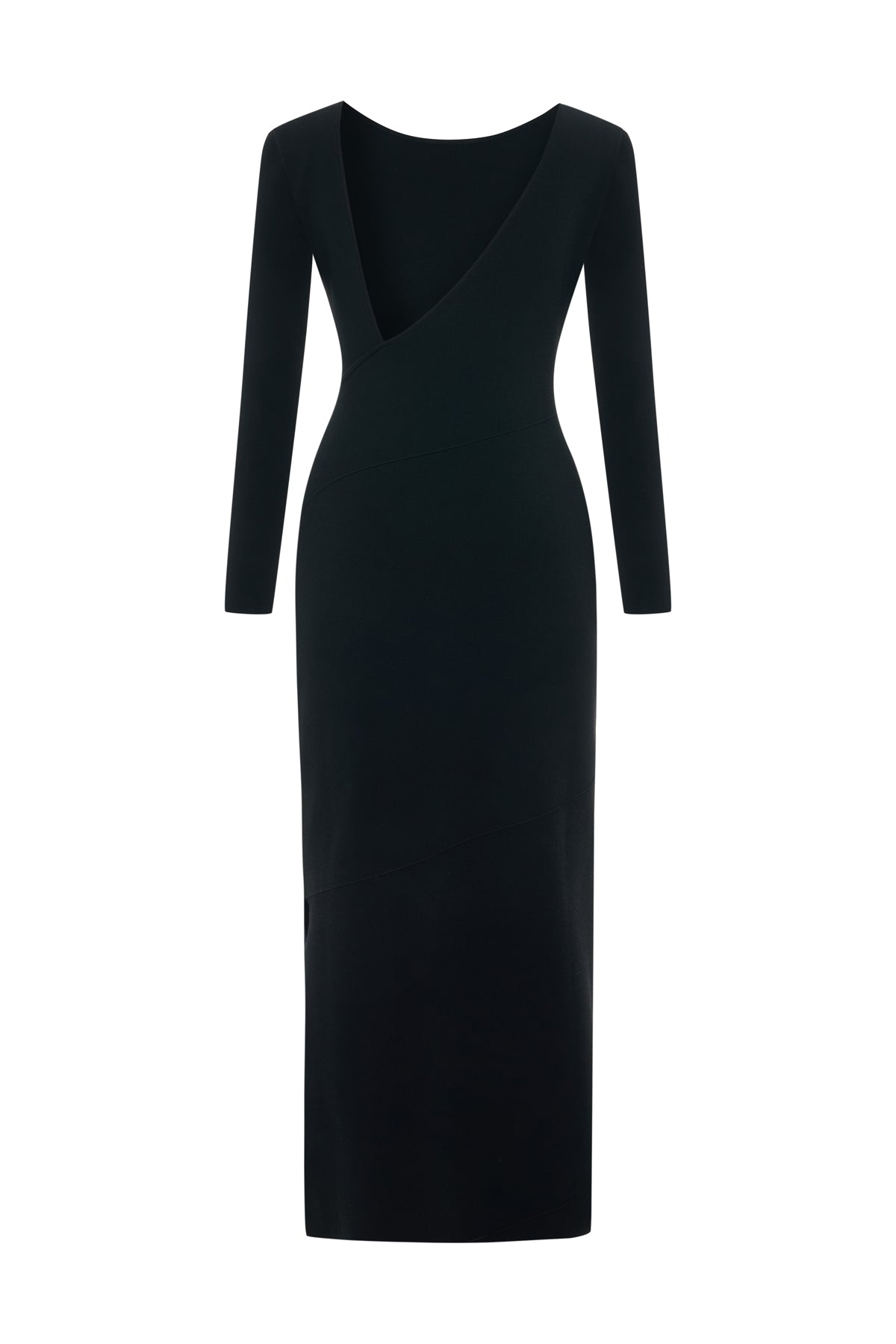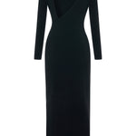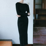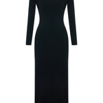 Knitted long-sleeve dress with a refined, body-skimming silhouette and an asymmetric open back. Offered in an enduring black hue, this elegant dress boasts a panelled construction, detailed with eyelet stitching. Falling to a calf skimming hem, it is finished with a slit at one side.