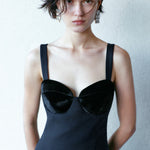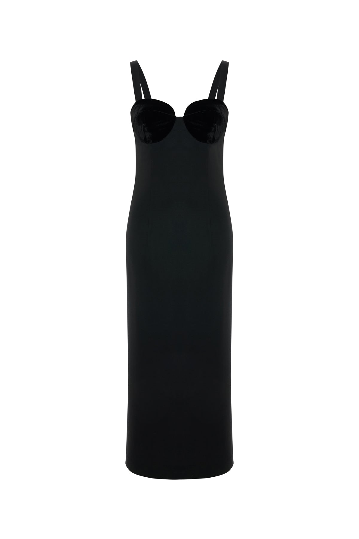 askılarında kontrast yaratan ipek kadife kullanılmıştır. Gizli arka fermuar ile