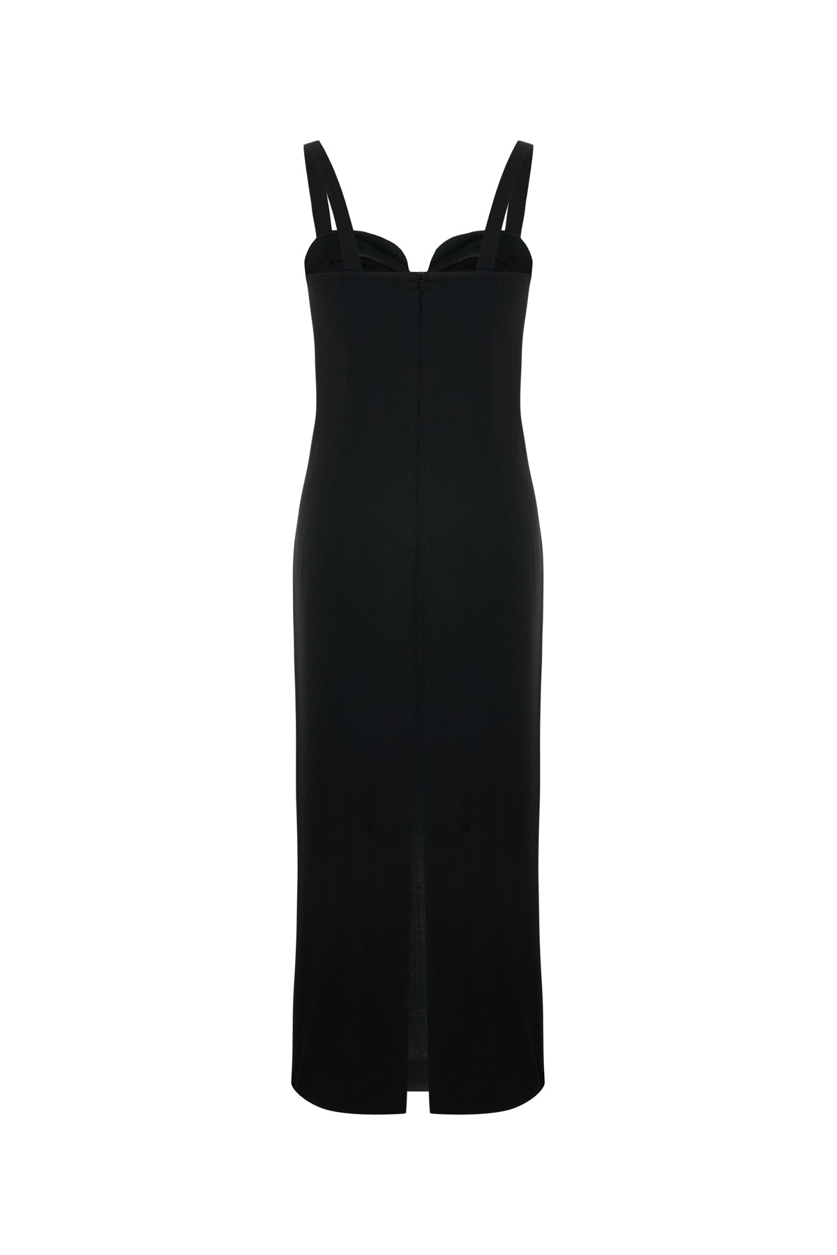 %100 yün kumaştan tasarlanan dar kesimli midi elbise. Göğüs kısmı ve omuz