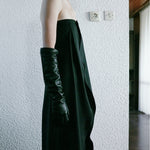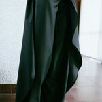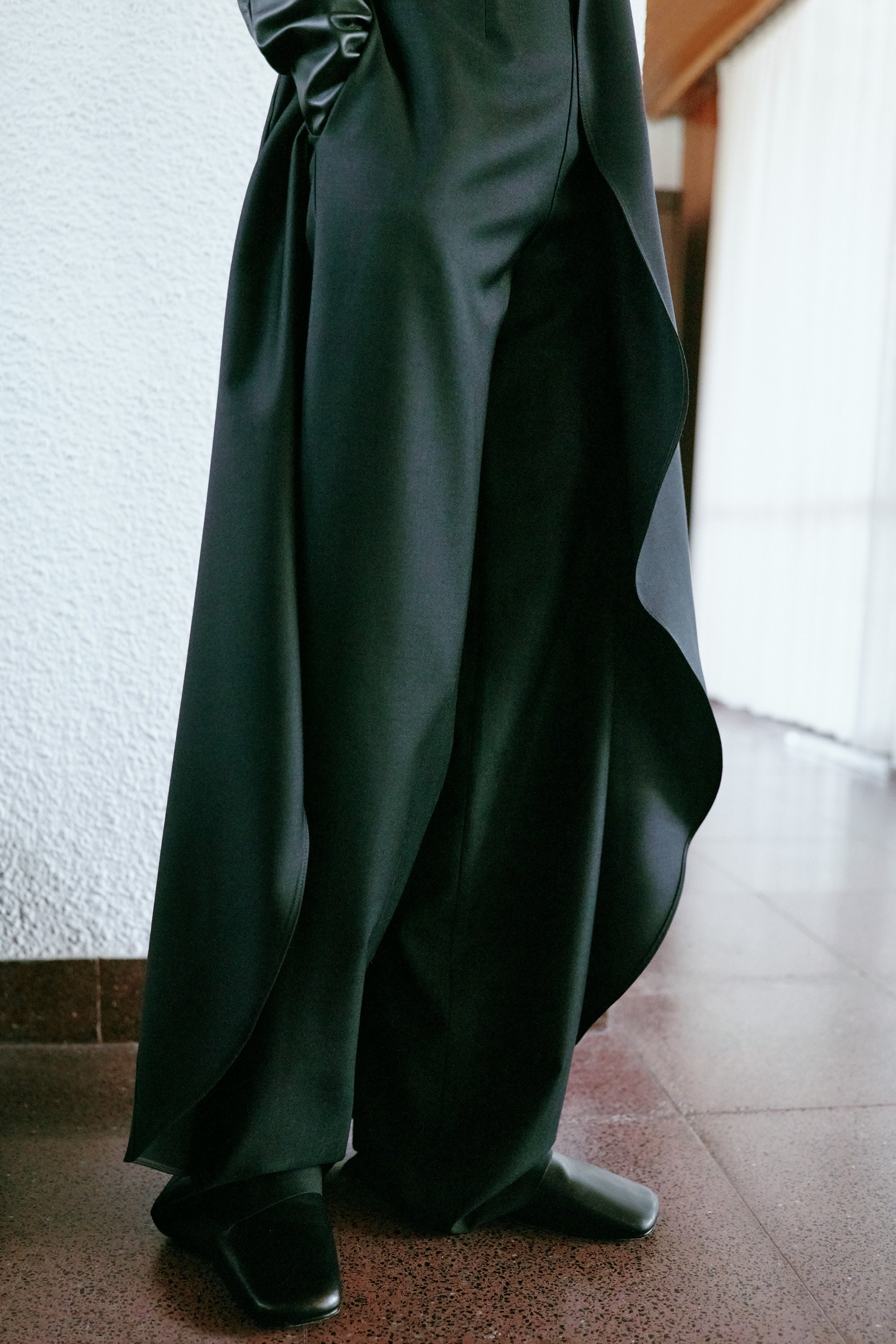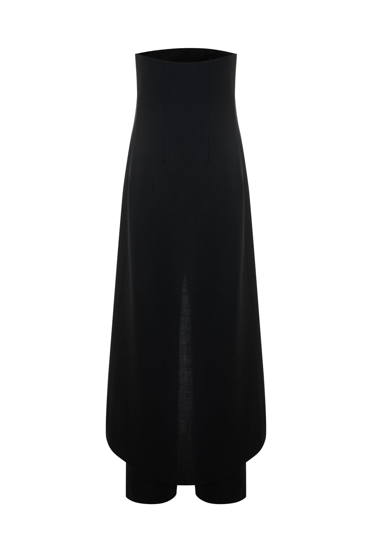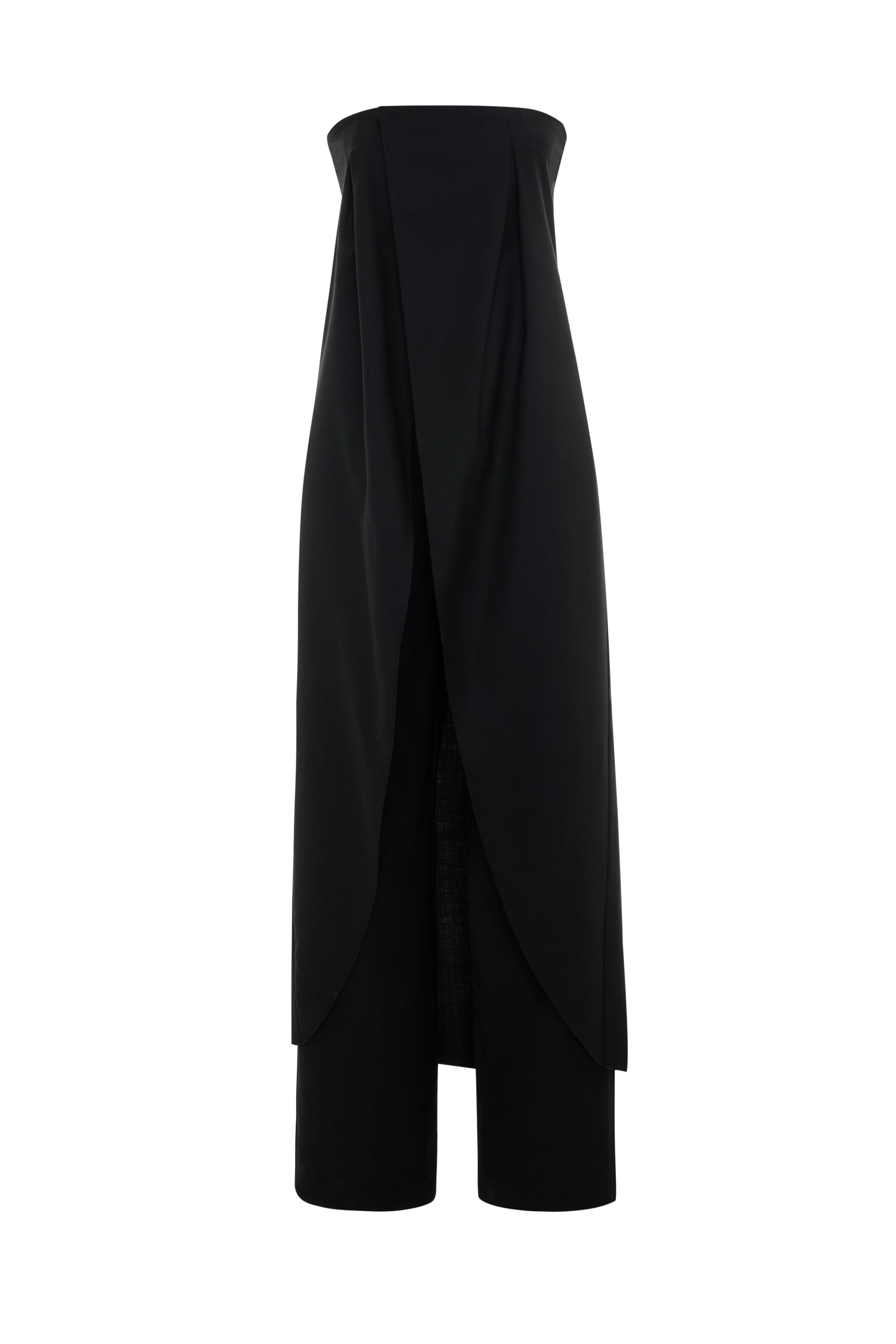 100% yün kumaştan tasarlanan pelerin efektli, straplez tulum. Hacim