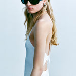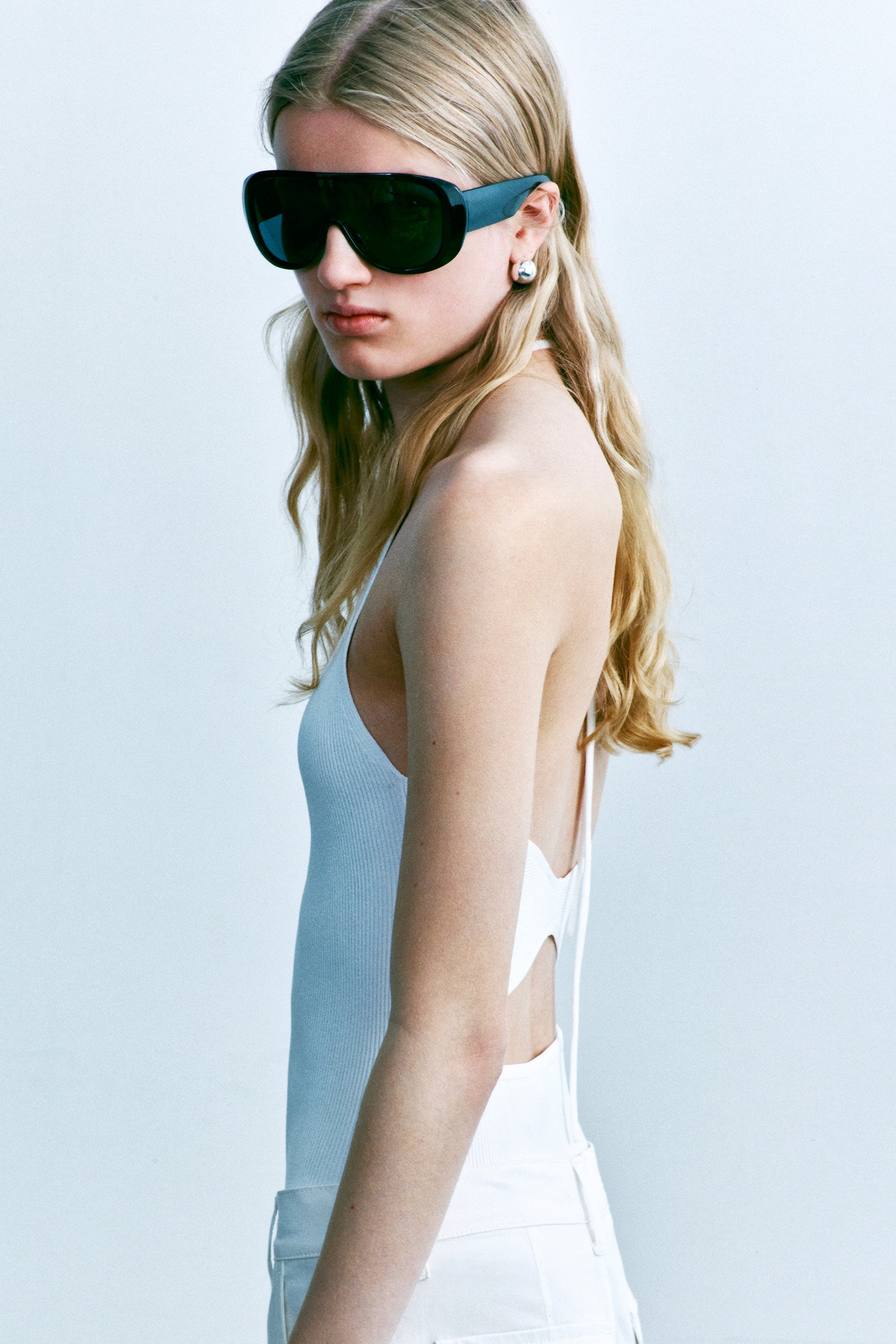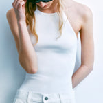 Sertifikalı sürdürülebilir viskon karışımlı triko bluz. Esnek yapısıyla vücudu saran halter yaka bluzun sırtı derin V kesimli ve geometrik kesik detaylıdır. Boyun arkasında ince askılarla bağlanır.
