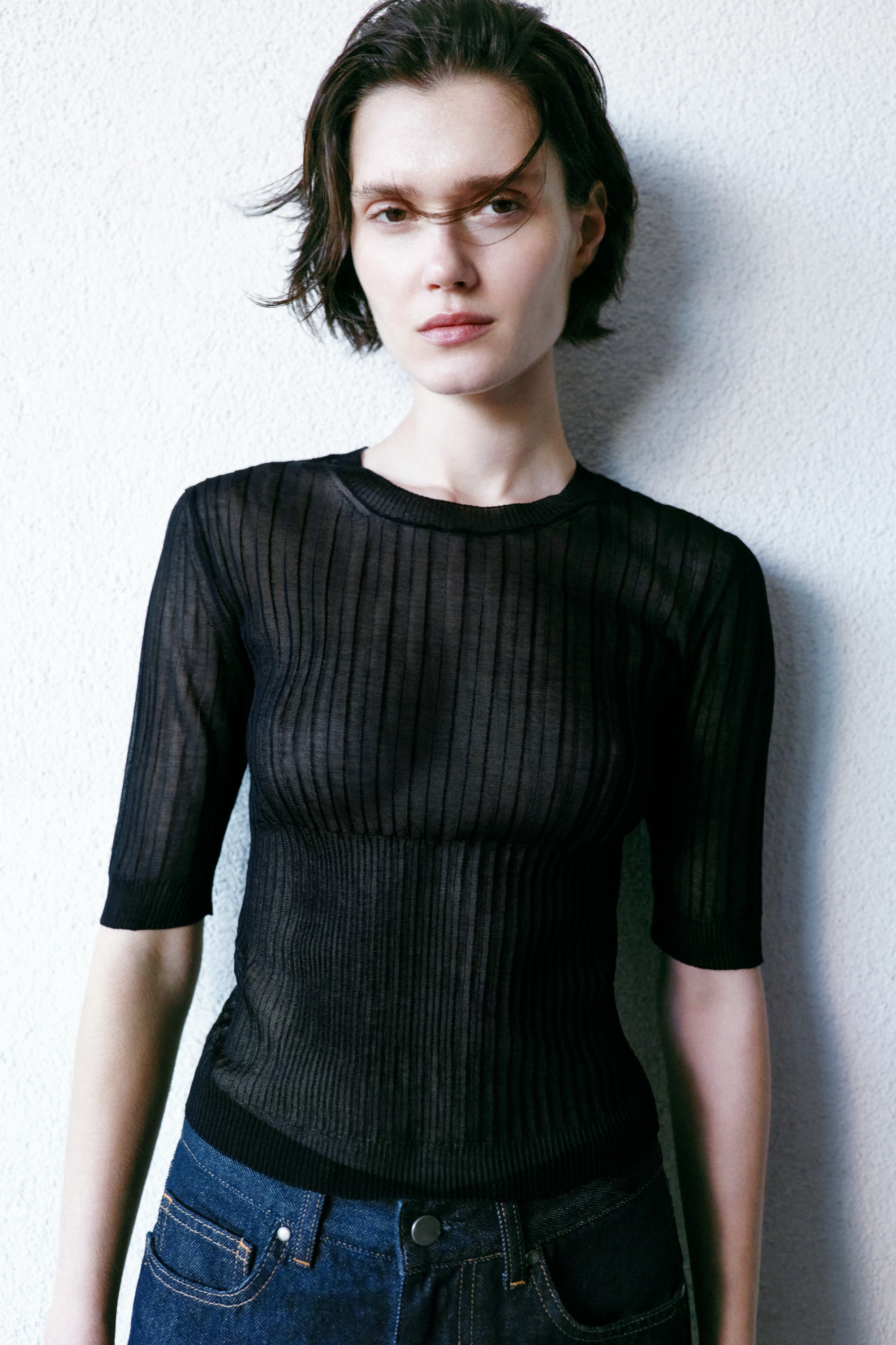iplikten üretilen, yarı transparan uzun kollu hırka. Vücuda oturan dar kalıba