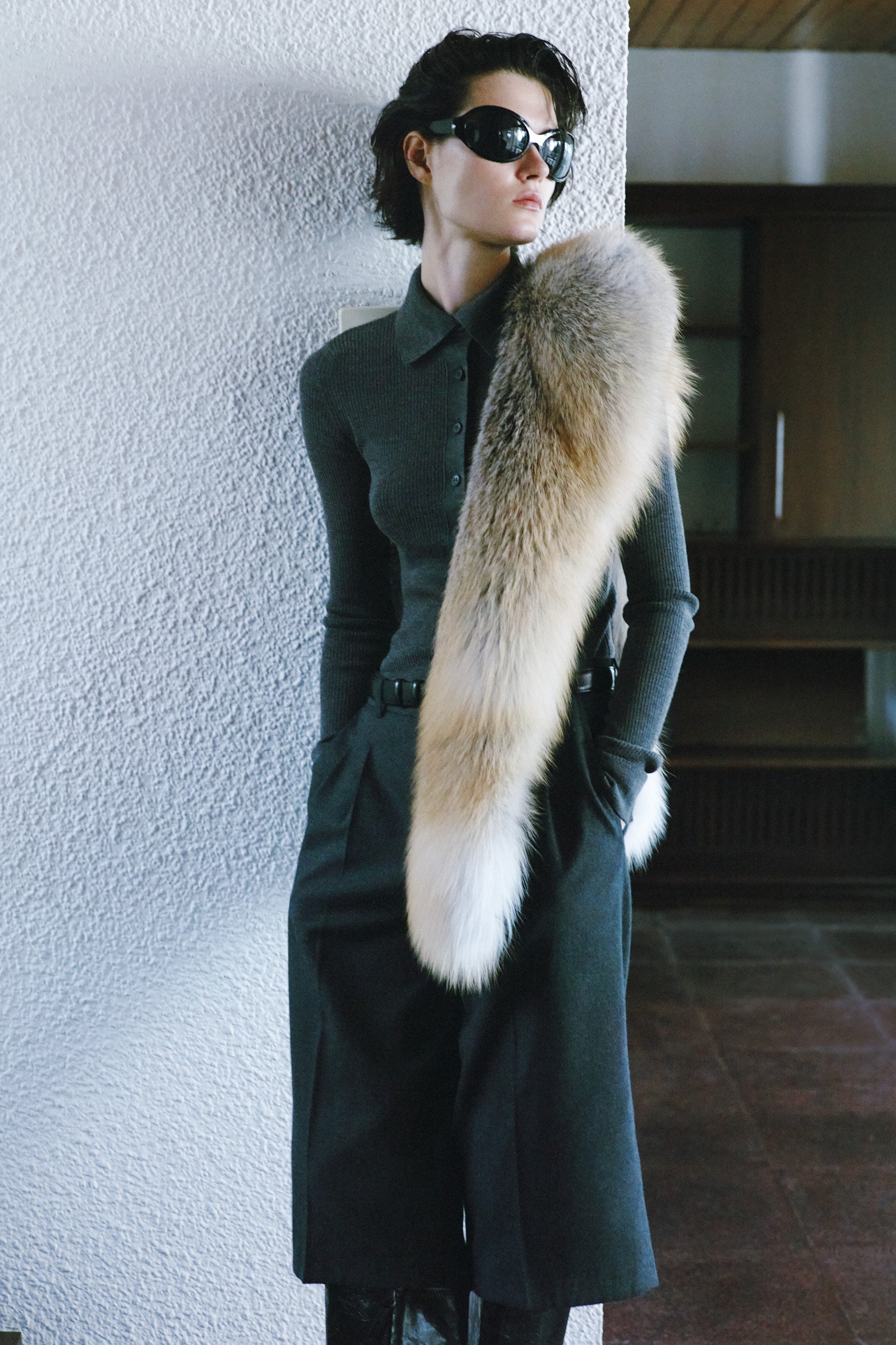 Vücuda oturan kesimini vurgulayan fitilli dokusunu elde etmesi için özel bir örgü tekniği kullanılmıştır. Yarım patlet üzerinde doğal boynuz düğmeler ile