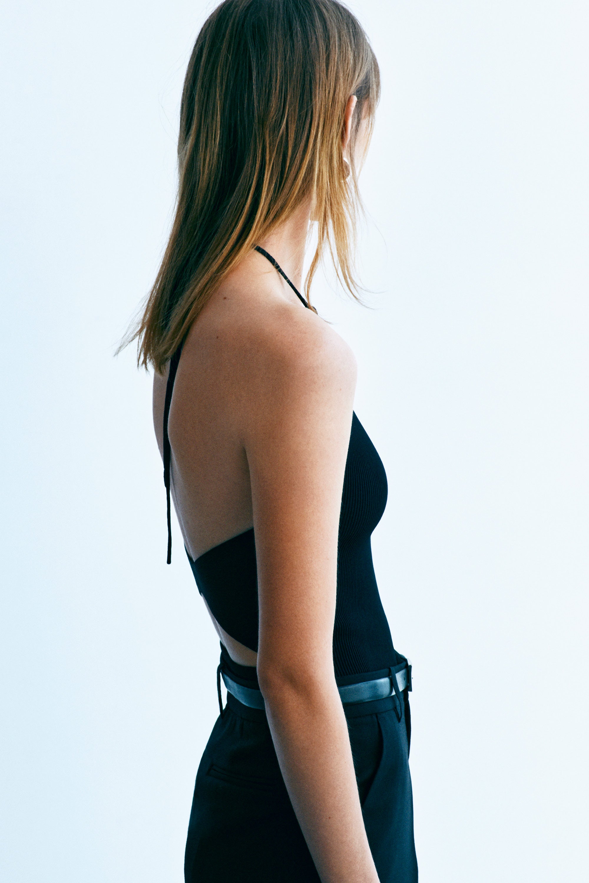 Sertifikalı sürdürülebilir viskon karışımlı triko bluz. Esnek yapısıyla vücudu saran halter yaka bluzun sırtı derin V kesimli ve geometrik kesik detaylıdır. Boyun arkasında ince askılarla bağlanır.