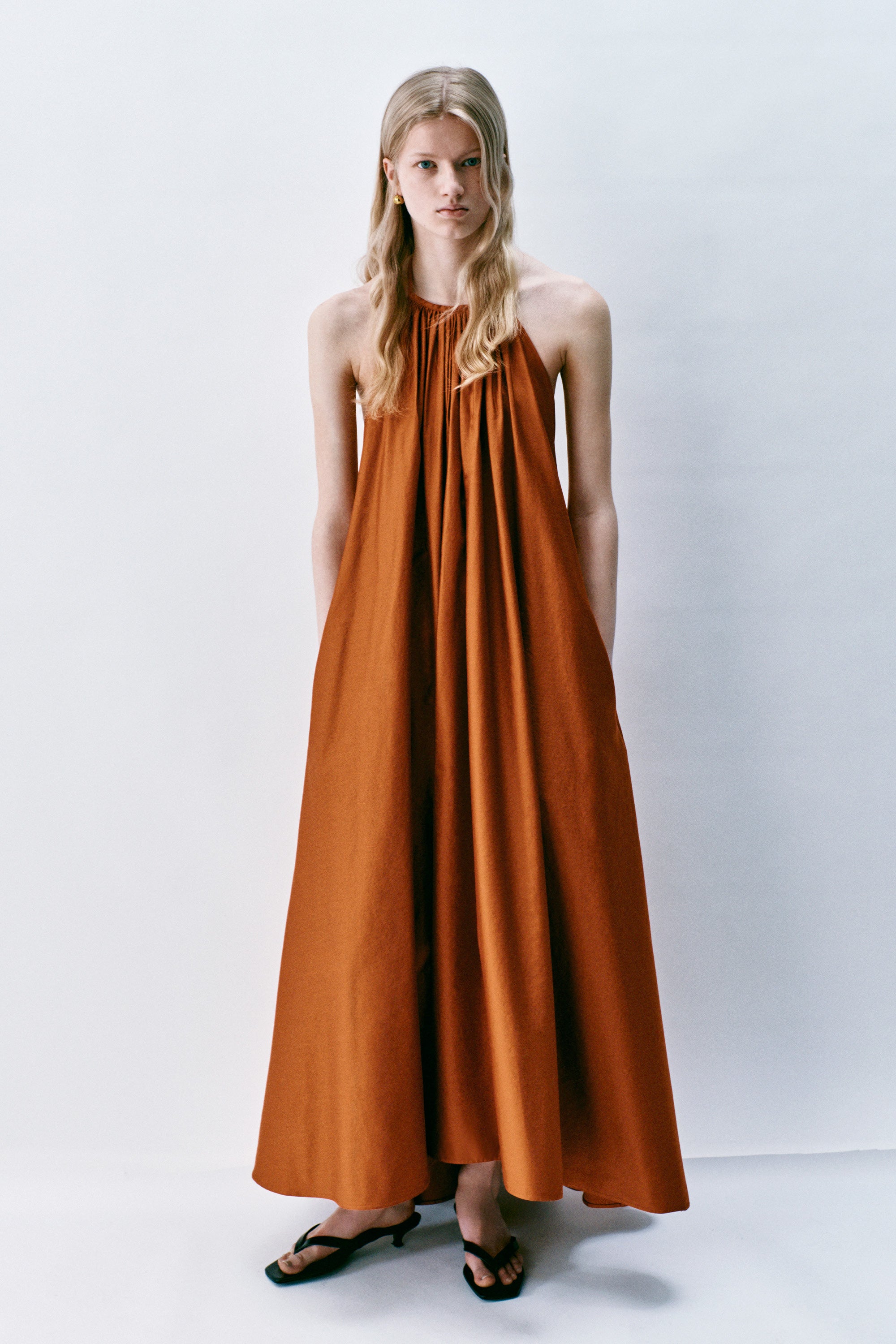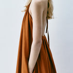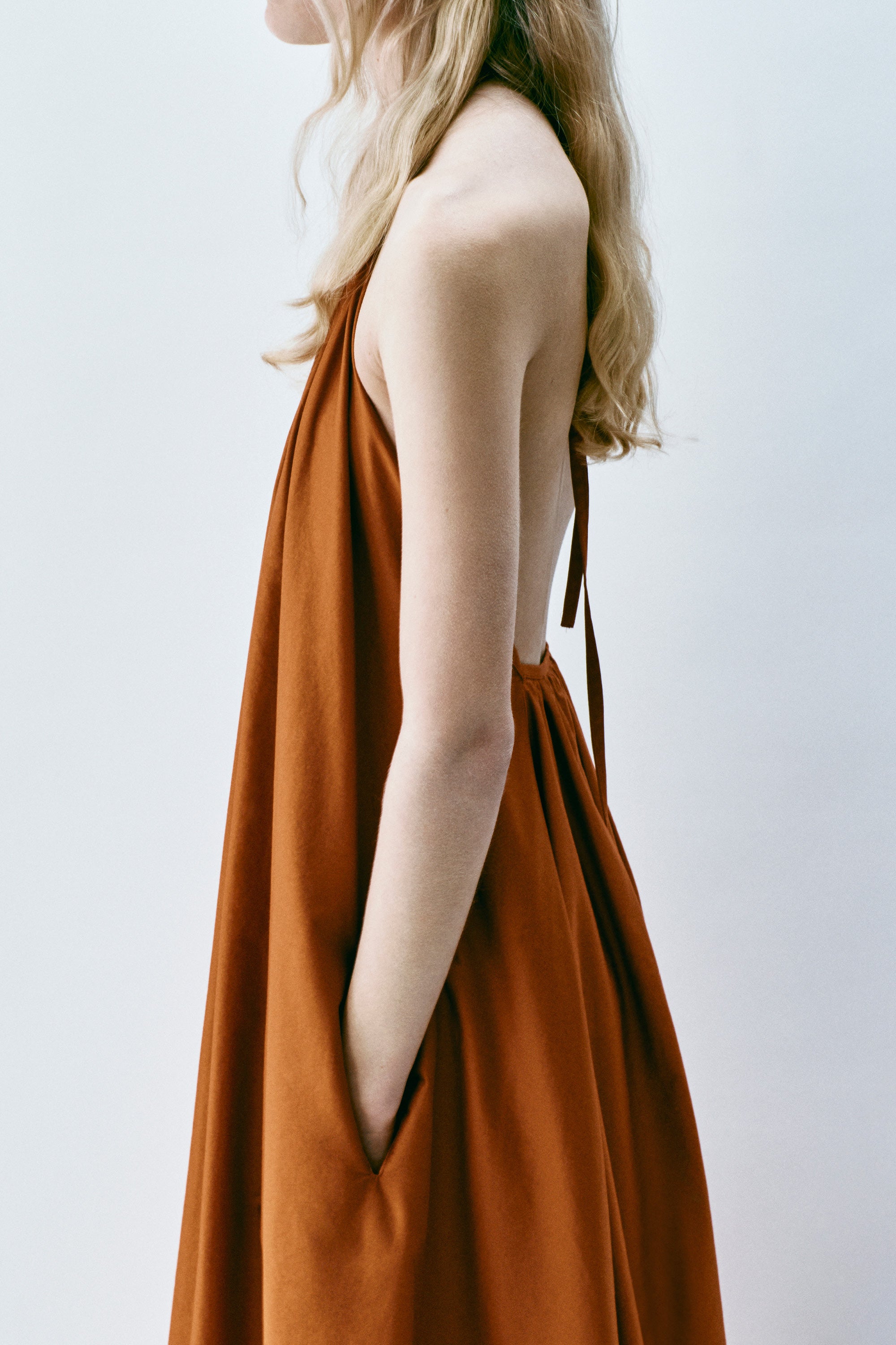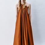 %100 koton kumaştan, hacimli siluete sahip, şık ve rahat elbise. Boyun arkasında ince askılarla bağlanan halter yaka elbisenin sırtı bel hizasına kadar açıktır. En sıcak günlerde bile serin ve konforlu hissettirecek ideal bir yazlık elbisedir.