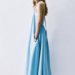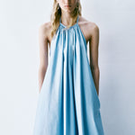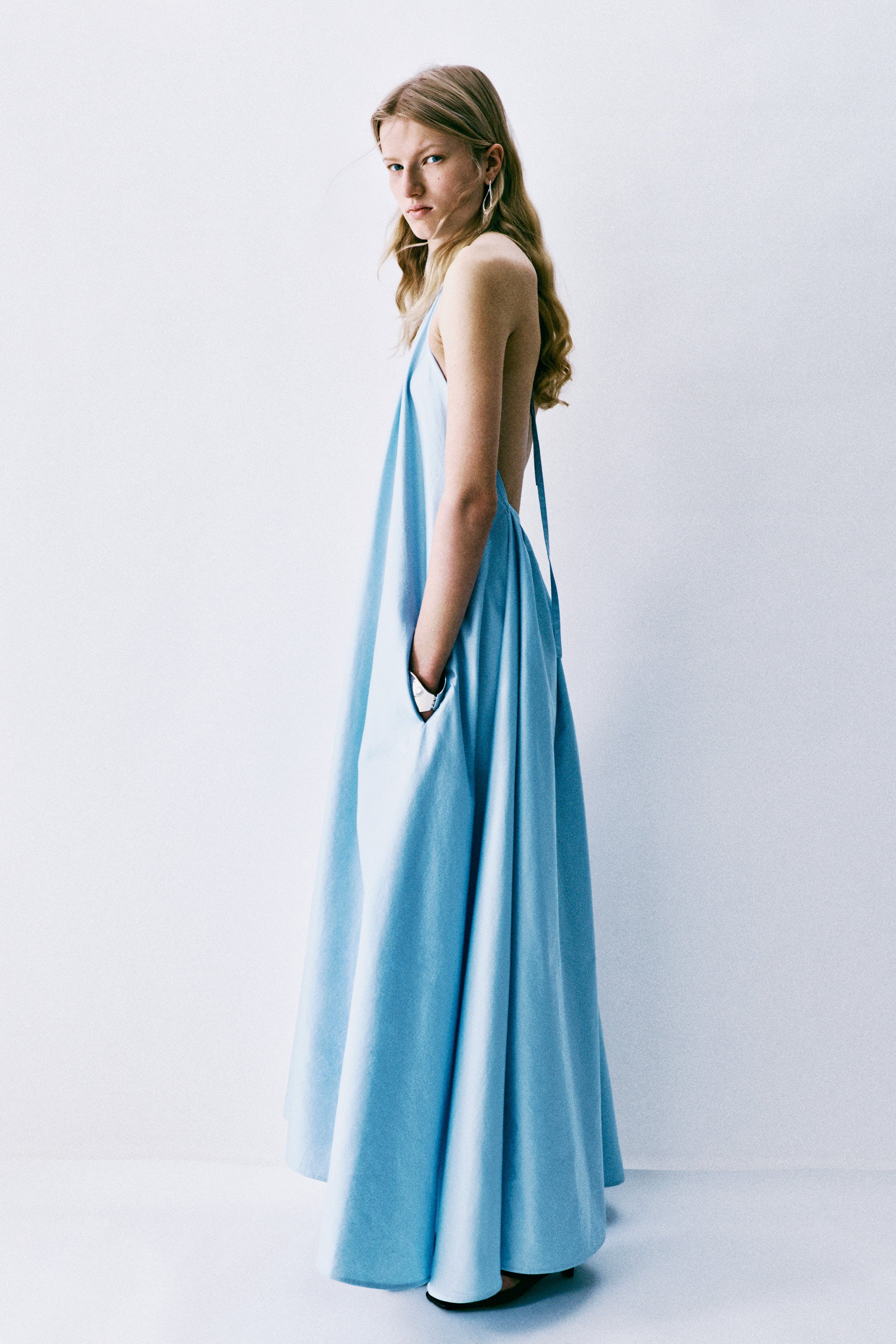 %100 koton kumaştan, hacimli siluete sahip, şık ve rahat elbise. Boyun arkasında ince askılarla bağlanan halter yaka elbisenin sırtı bel hizasına kadar açıktır. En sıcak günlerde bile serin ve konforlu hissettirecek ideal bir yazlık elbisedir.