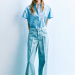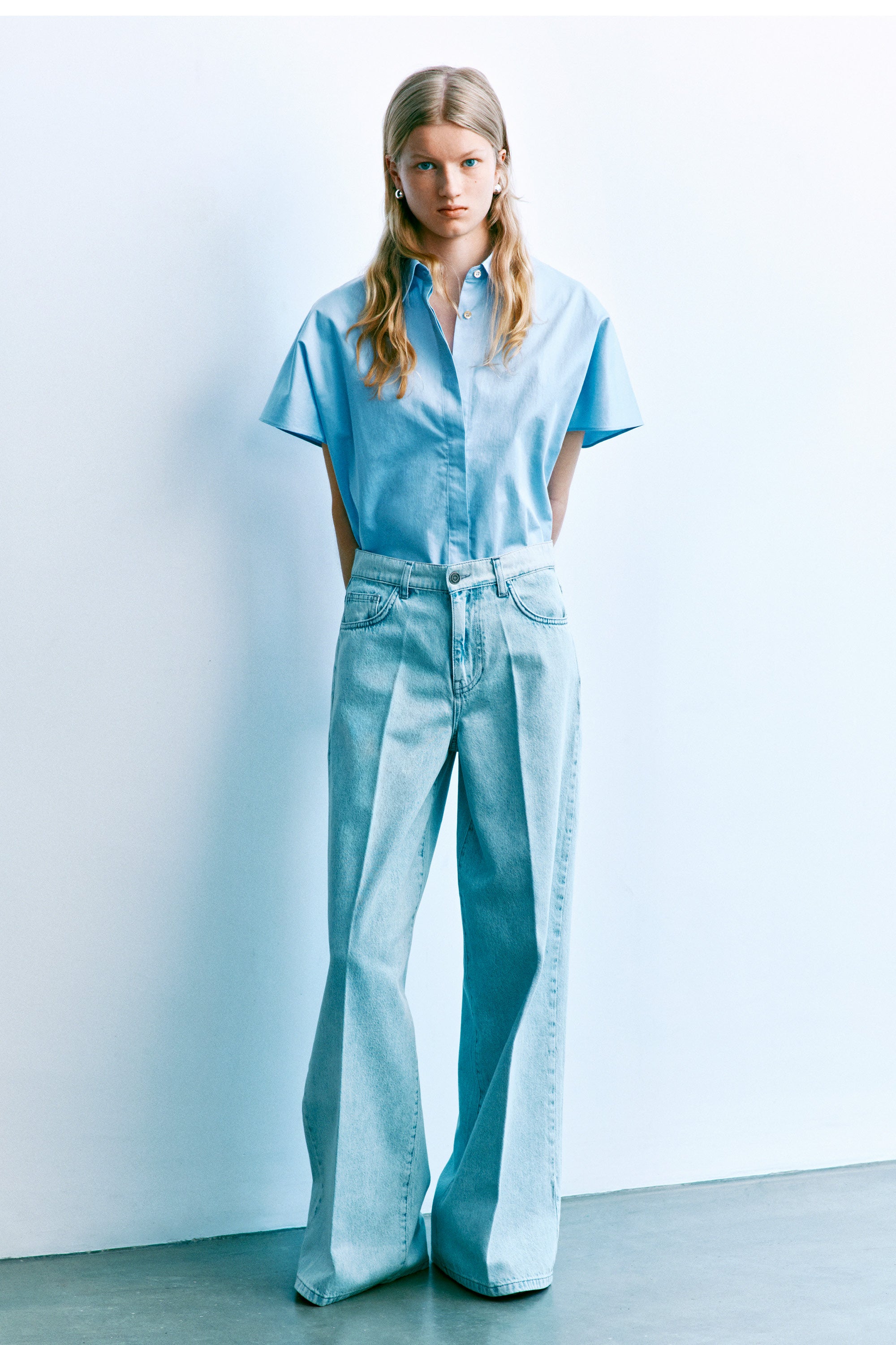 Geniş paçalı, orta bel denim pantolon. Klasik beş cepli ve önden ütü izlidir. Kemer halkaları ile tamamlanmıştır. Önden fermuar ve logo baskılı çakmalı denim düğmesi kapamalıdır.