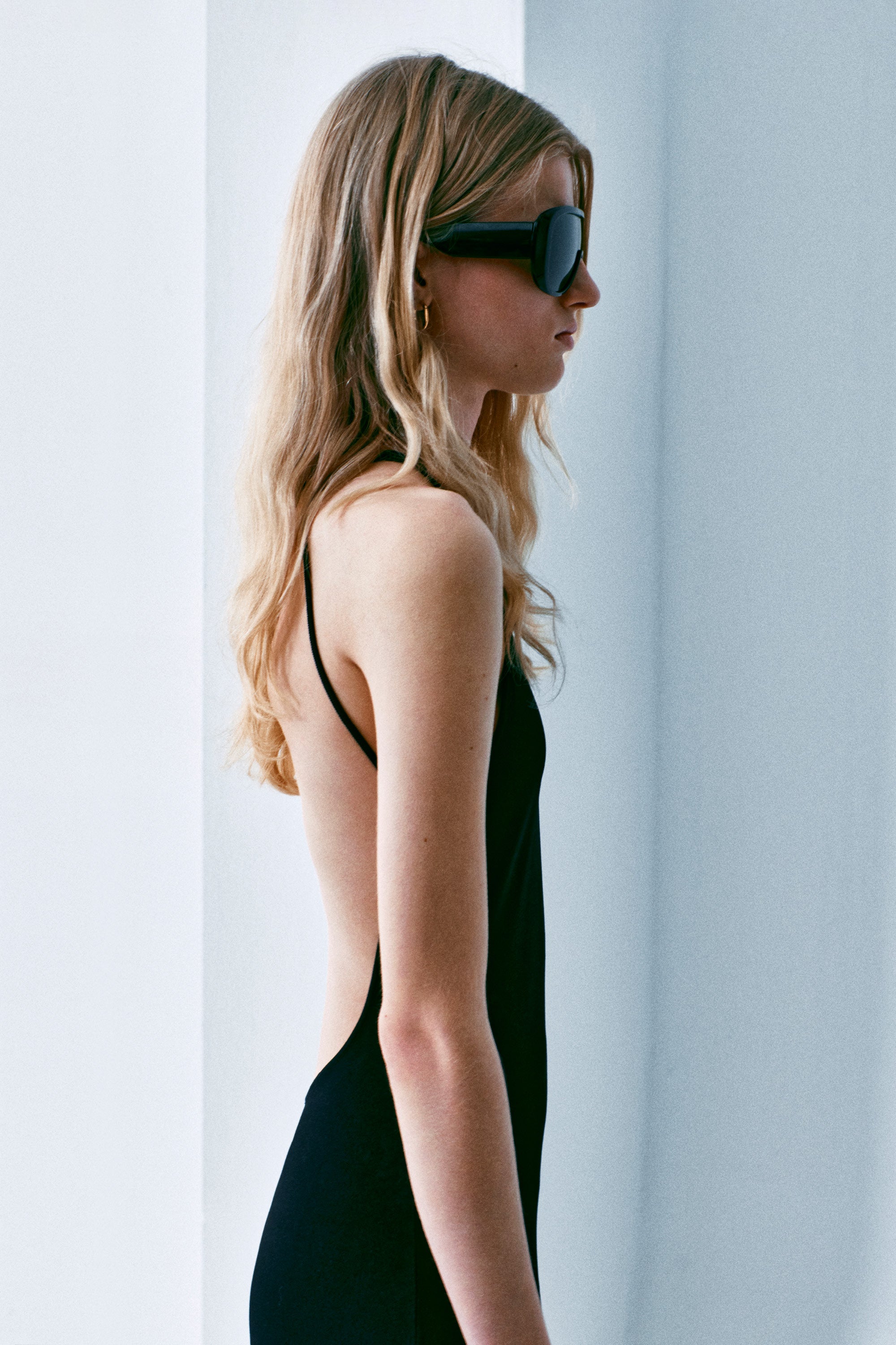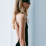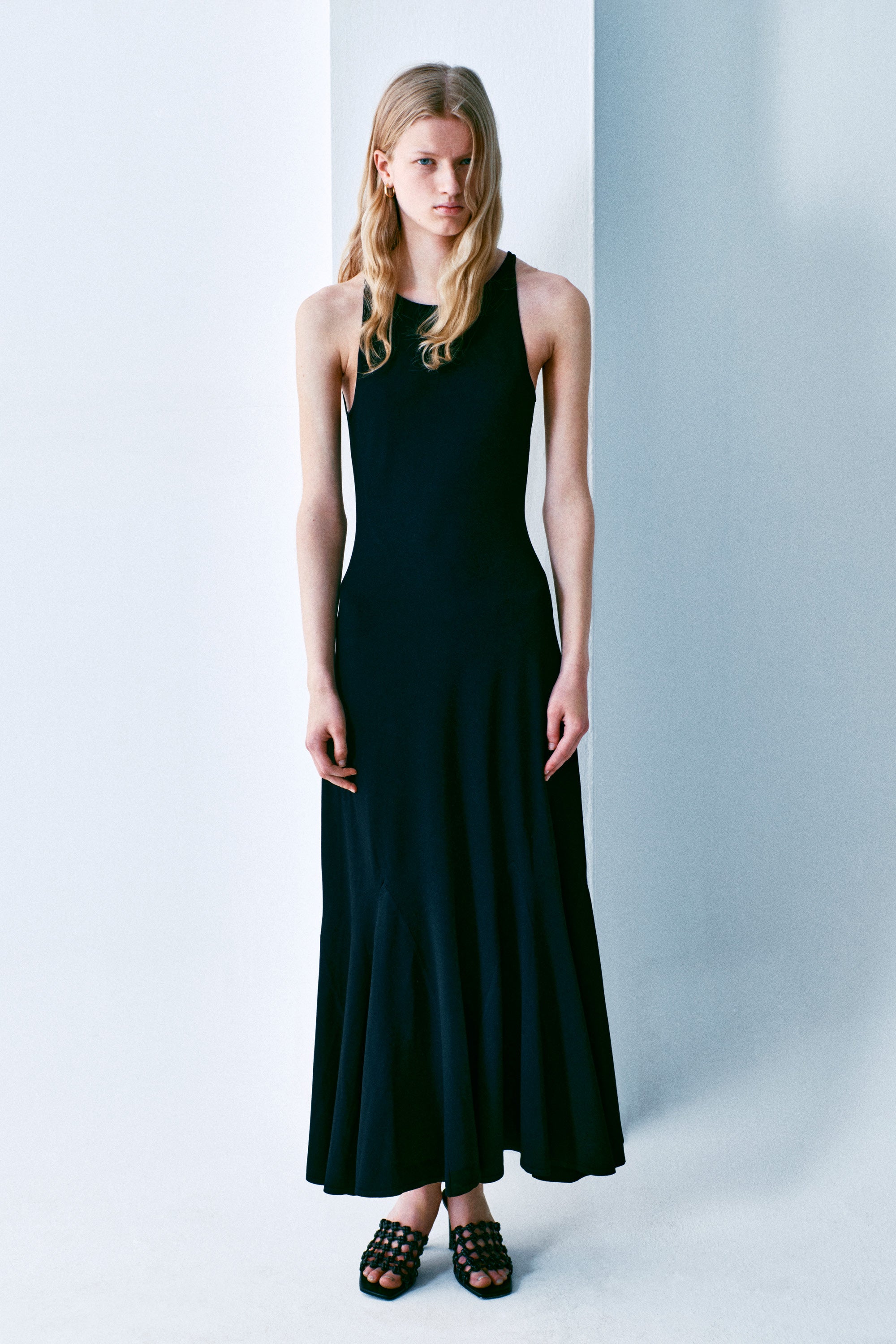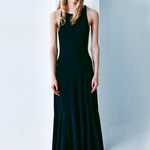Sertifikalı sürdürülebilir viskon içerikli, halter yaka, uzun triko elbise. Arka kısmında asimetrik askılı yuvarlak açık sırt detayına sahiptir. Üst bedeni vücuda oturan elbise, etek ucuna doğru hafifçe genişlemekte ve kloş gode kesimi ile zarif bir hareket kazanmaktadır.