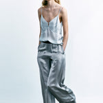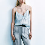 Yumuşak cupro kumaştan tasarlanan, önde ve arkada derin V yaka kesimli, kamisol bluz. Ayarlanabilir ince omuz askılarına sahip bluz, göğüs kısmında zarif biye detayı ile tamamlanmıştır.