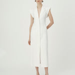 Net pamuktan dikilmiş midi gömlek elbise. Bardot Elbise rahat ama rafine silüetiyle zahmetsiz bir zarafet havası yayıyor. Göğüs kısmı balenli ve çarpıcı bir açık sırtla süslenmiş. Kısa kollar, çentikli yakalar ve gizli düğmeli bir çıtçıtla tamamlanmıştır.